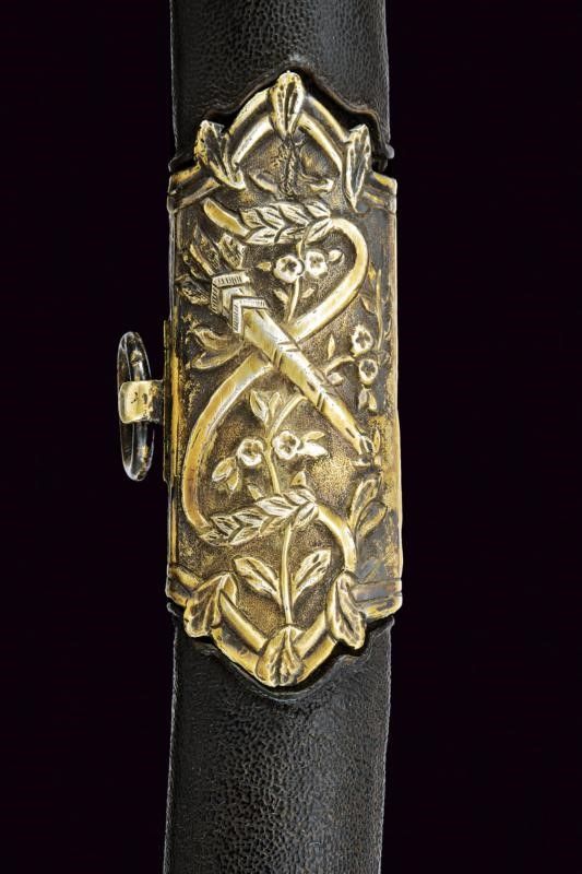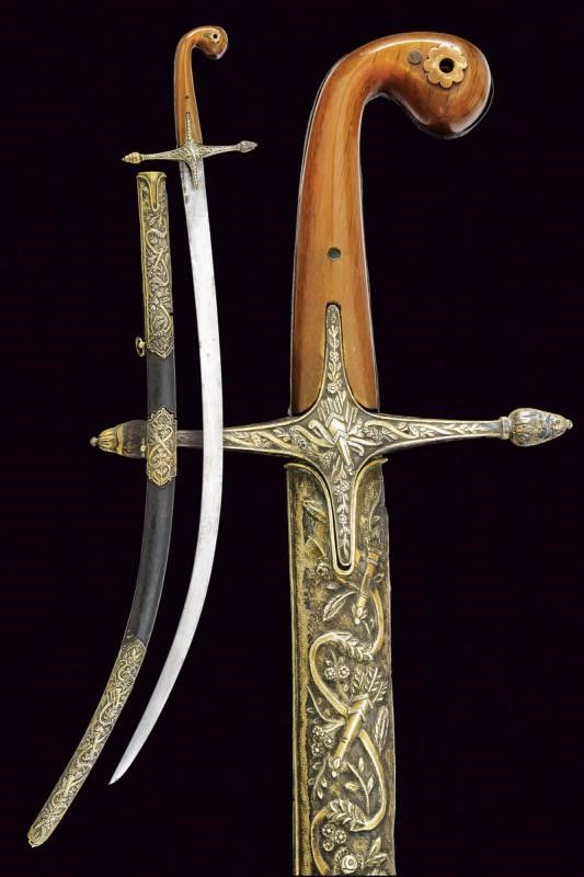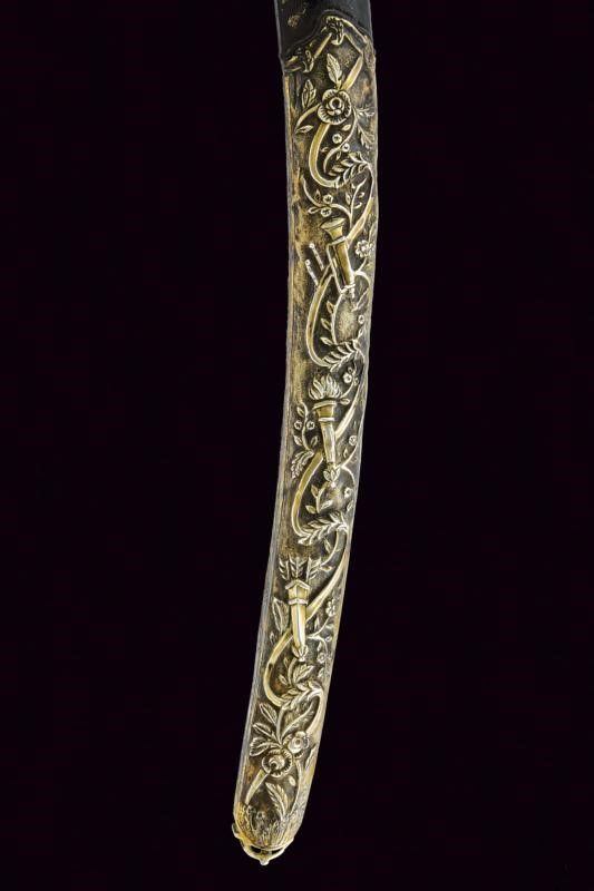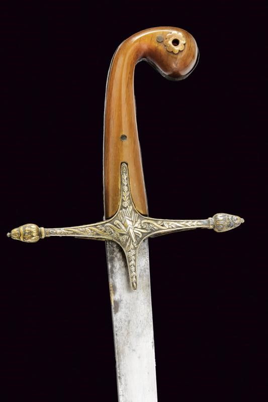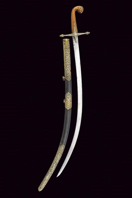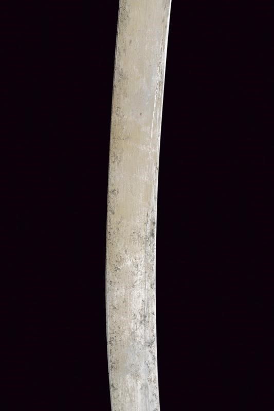 XIX Secolo Lama piatta, curva, a un filo, in damasco (poco visibile, da pulire). Fornimento a croce in argento con resti di doratura, finemente inciso a motivi floreali e geometrici, come anche la banda centrale dell'impugnatura. Punzone. Guancette in corno con pomo controcurvato rispetto alla lama. Fodero in legno rivestito di cuoio con bellissimi fornimenti in argento, incisi e sbalzati a trofei e motivi floreali, vari punzoni.