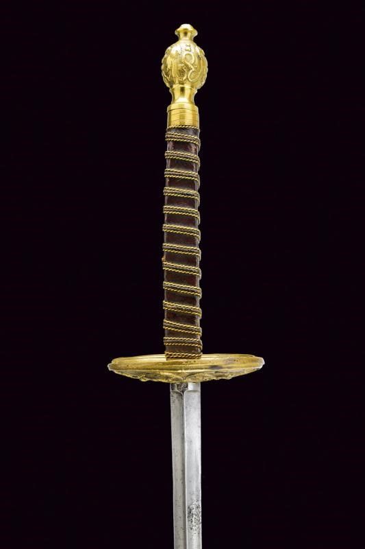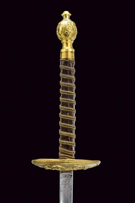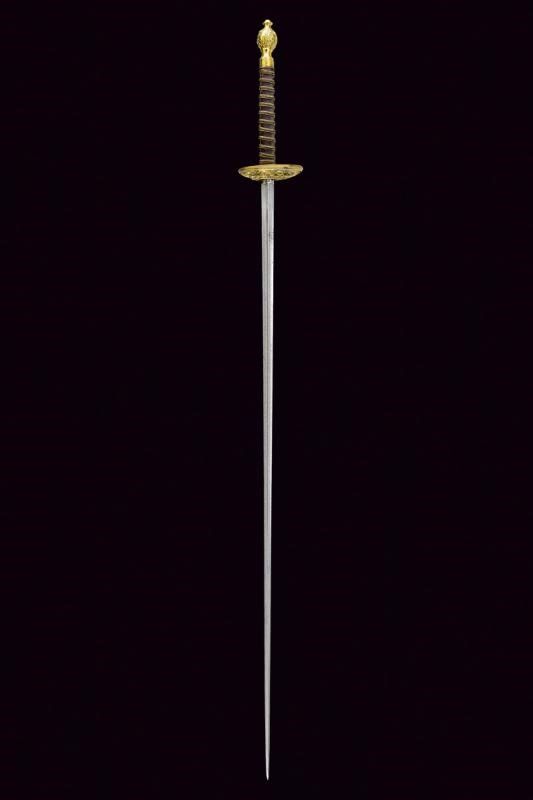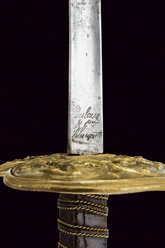 Klingenthal, lunghezza 103 cm. Fine del XIX Secolo Lama triangolare a facce incavate, con punzoni alla base e marca 'Coulaux & C.ie Klingenthal'. Fornimento in ottone a due valve decorate, come il pomo, a volute in bassorilievo. Impugnatura quadra rivestita in cuoio con trecciola metallica.