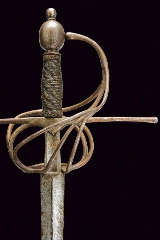 Italia, lunghezza 131 cm. 1600 circa Raro tipo di lama dritta a due fili, rilevata al centro, con ricasso scanalato. Fornimento in ferro con ponticello e un ponte, pomo a oliva bottonata. Controguardia a tre rami. Impugnatura in legno rivestita con trecciola e dotata di teste di moro in filo metallico originale. In patina, mai pulita.