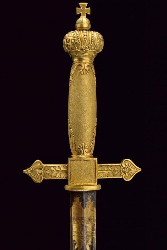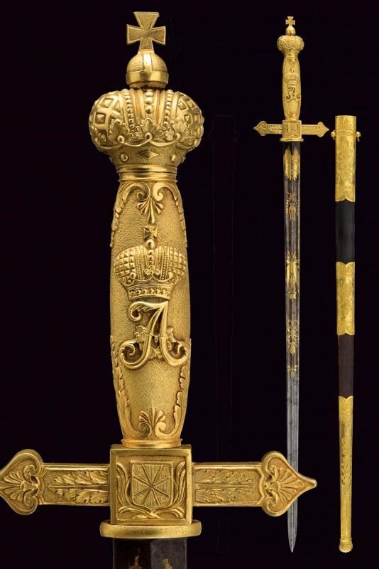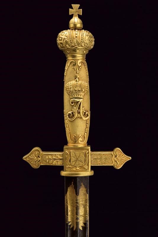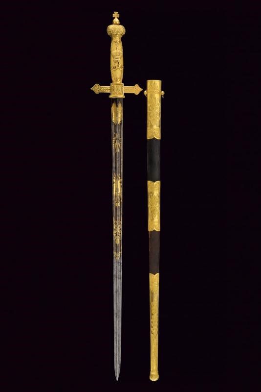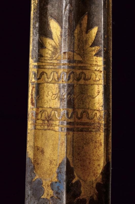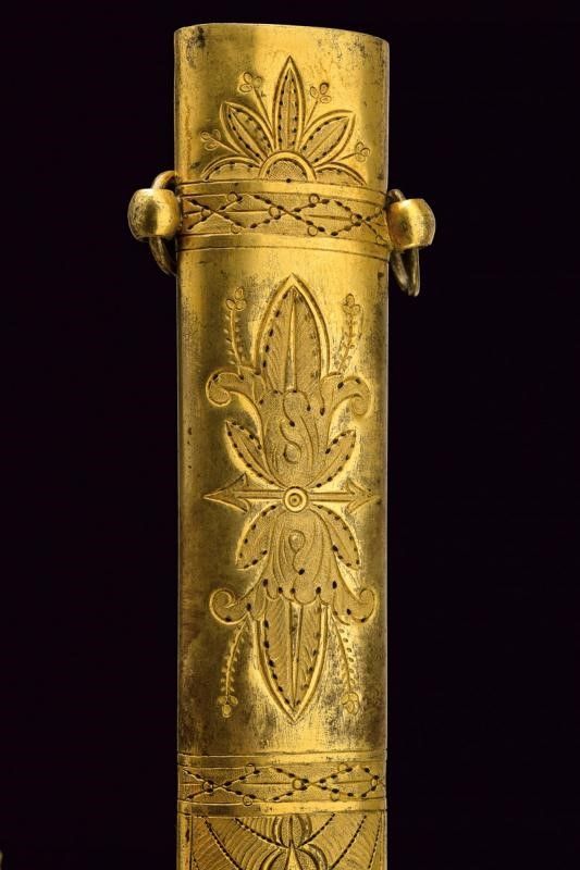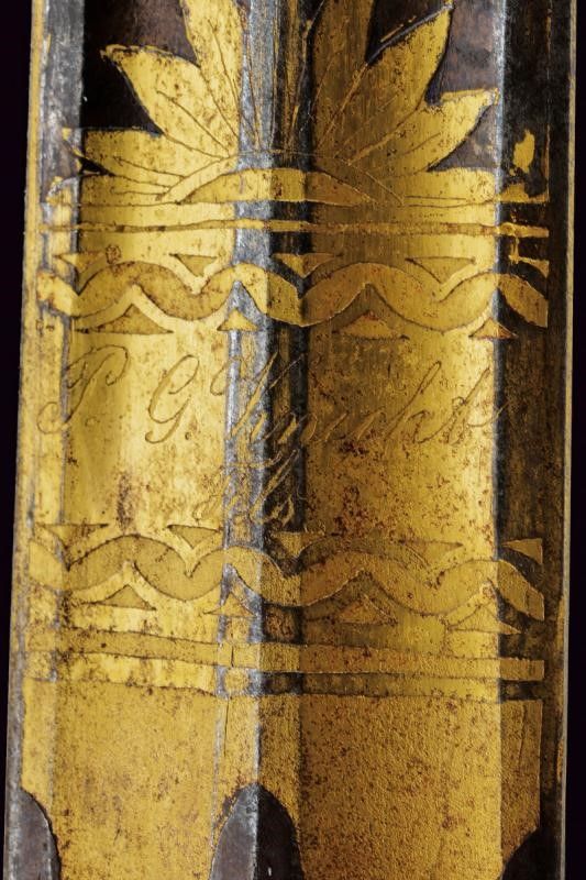 primo quarto del XIX Sec. Lama di fabbricazione tedesca, di forma dritta, a due fili con duplice scanalatura, finemente incisa e dorata su fondo blu a trofei, con lira e disegni floreali; firmata alla base 'P. G. Knecht in Solingen'. Fornimento di fattura francese imperiale, in ottone dorato al mercurio. Massello dell'elso di forma quadra recante un ordine (Sant'Anna?), bracci decorati a foglie e con testa a cuore. Pomo a corona imperiale. Impugnatura in un solo pezzo, con monogramma 'A' coronato, su fondo granulato ed entro cornice di foglie in bassorilievo. Fodero in legno rivestito di cuoio con fornimenti in ottone, dorati ed incisi a motivi floreali a decorazioni in stile Impero. Due campanelle. Bellissima arma di grande qualità.
