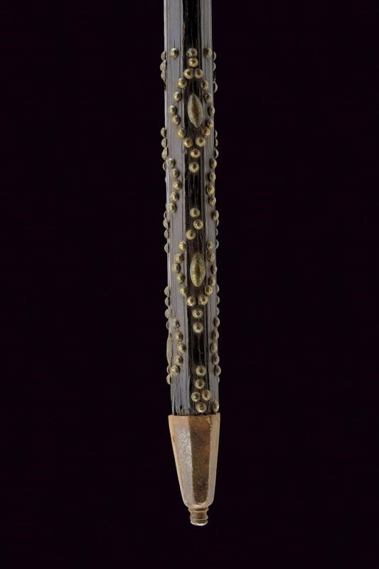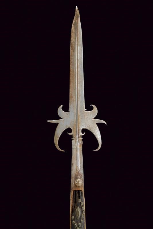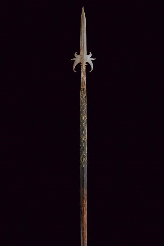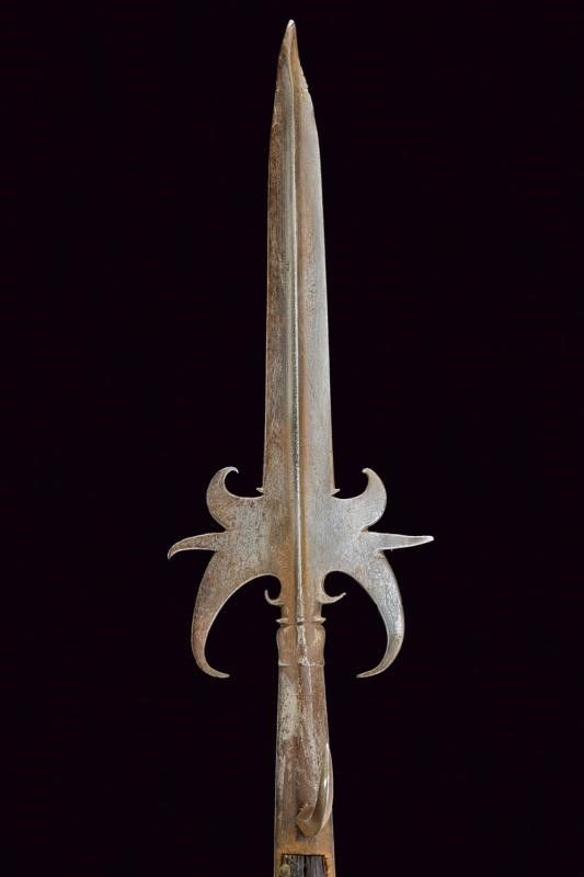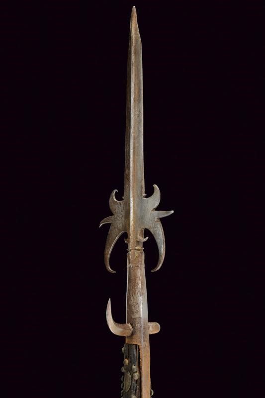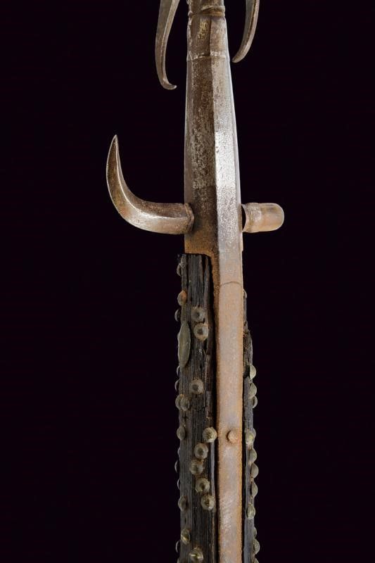 Europa, lunghezza 205 cm. fine del XVII Sec. Cuspide a due fili fortemente nervata al centro, con triplici ali alla base e piccoli ganci. Gorbia faccetta con robusto gancio per la lanterna. Bandelle piatte leggermente accorciate, su fusto ligneo antico (piccole mancanze) ornato con rivetti in bronzo alle due estremità; piede in ferro.