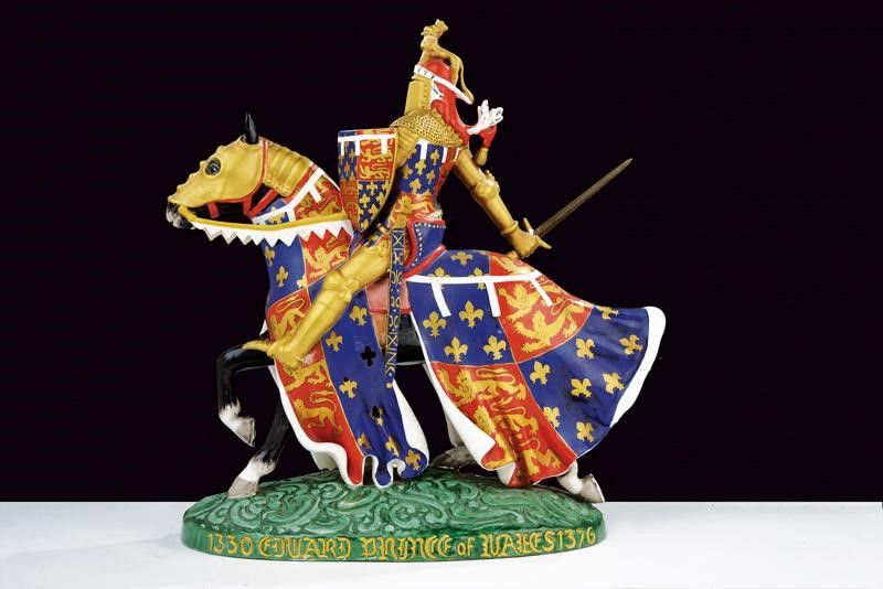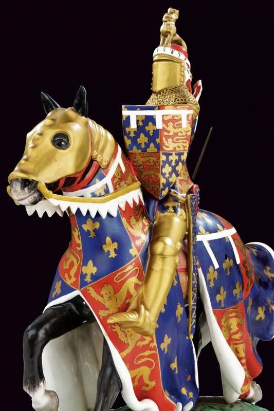 Portogallo, altezza 33 cm. Prima metà del XIX Secolo Bel gruppo scultoreo equestre nel quale Edoardo di Woodstock sul suo destriero completamente bardato, è coperto da un'armatura dorata ed ha la spada sguainata. Quasi tutta la statuetta dipinta con gli emblemi reali dei tre leoni dorati su campo rosso e con gigli su campo azzurro. Su piedistallo dipinto in color verde, recante al bordo, in caratteri gotici: '1330 THE BLACK PRINCE 1376 / EDWARD PRINCE OF WALES 1376'. Il fondo marcato 'SACAVEM PORTUGAL' in oro.