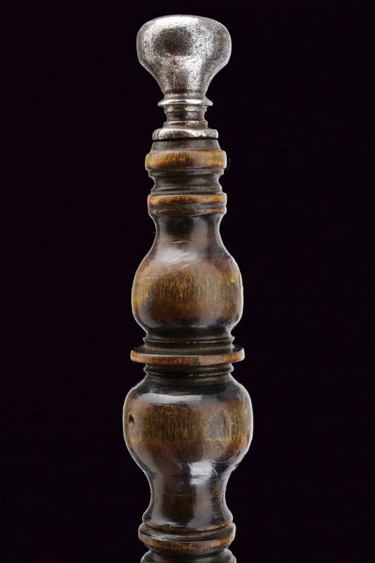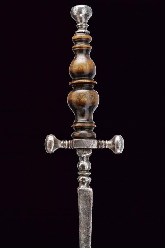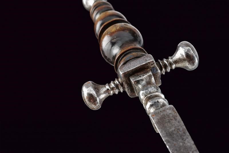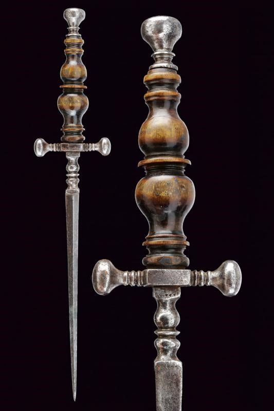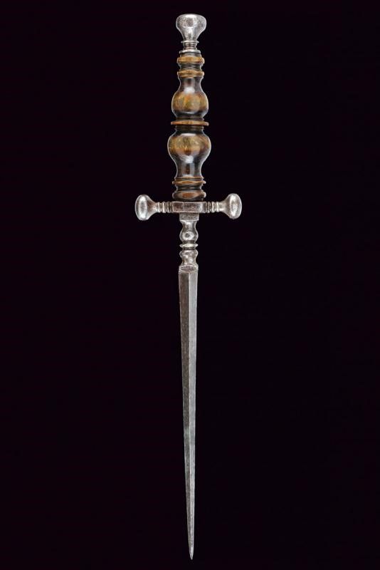 Italia, lunghezza 28.6 cm. 1640 circa Lama dritta di sezione triangolare, decorata alla base con un disegno a puntini; doppi nodi suddivisi da un disco. Elso a bracci corti con estremità lenticolari. Pomo lavorato en suite. Bella impugnatura in corno finemente scolpita a balaustro.