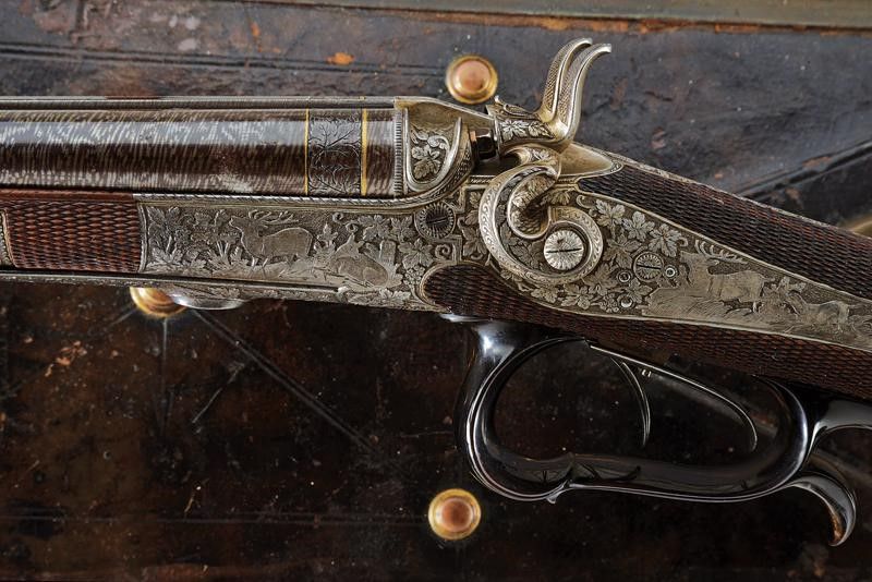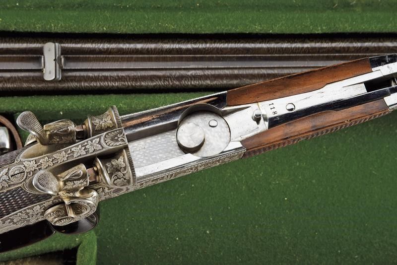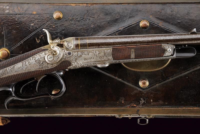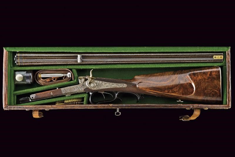 terzo quarto del XIX Sec. Canne rigate, tonde, damascate e brunite, con bindella firmata 'A. Haedge Hofbüchsenmacher Berlin', incise alla base con cornice in oro, dotate di alzo, con mirino in argento foderato in osso, cal. 10 mm; lunga codetta incisa; batterie a molla indietro con finissime incisioni di cervi fra racemi, il castello, la leva e gli altri fornimenti incisi allo stesso modo; azionando la leva si alzano le canne, si estraggono le cartucce e si armano i cani; calcio ed astina in radica con zigrinature; ponticello con poggiadito in corno scolpito; sotto alla canna il monogramma 'KS' in oro. In cassetta di cuoio foderata internamente di panno verde, con alcuni attrezzi. Bellissima arma di alta qualità del noto armaiolo della corte imperiale.