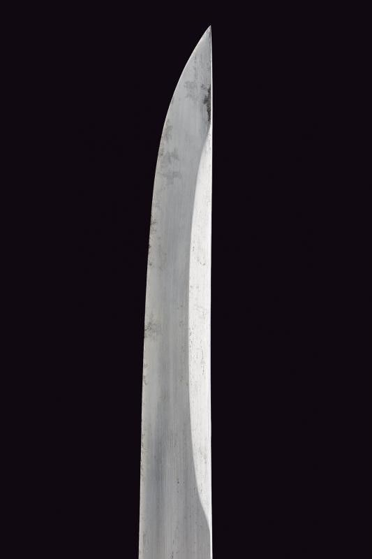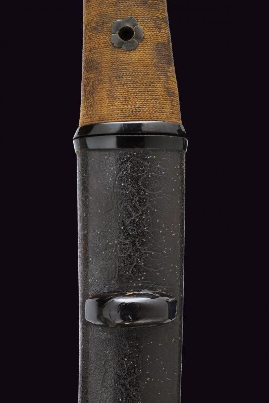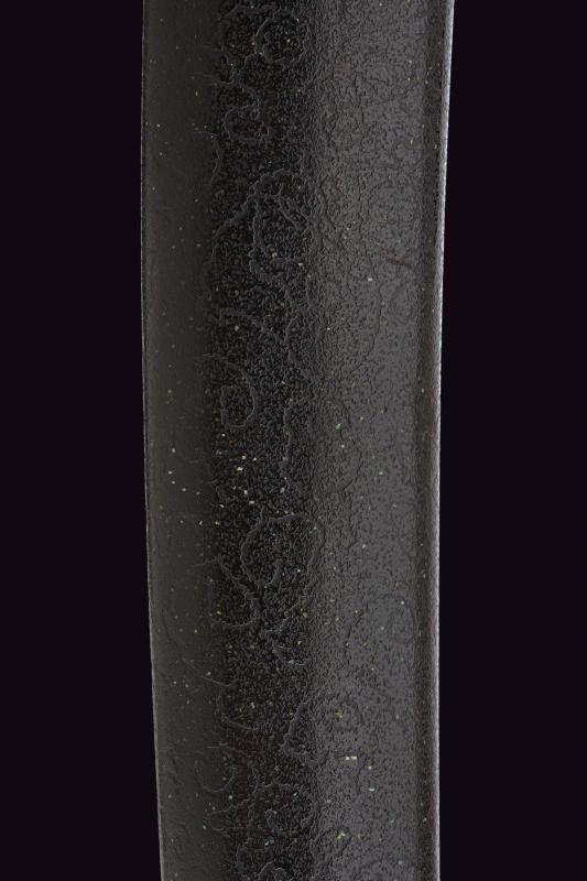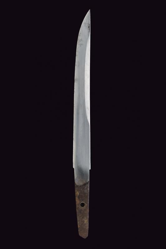 Giappone, lunghezza 33.5 cm. Periodo Edo (1603-1867) Lama (Nagasa di 22 cm) con hamon e hada non visibili; zone con danni e piccoli difetti dovuti alla ruggine (necessaria pulizia); habaki in bronzo inciso. Nakago mu-mei, con un mekugi-ana. Saya laccata di nero con Ishime-nuri (texture di pietra grezza), finitura lucida su Koiguchi, Kojiri e Kurikata.