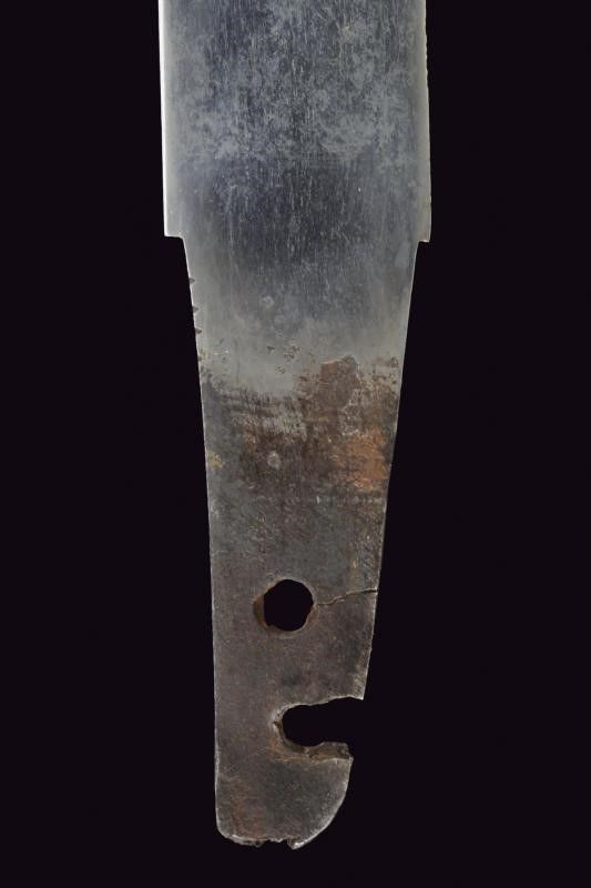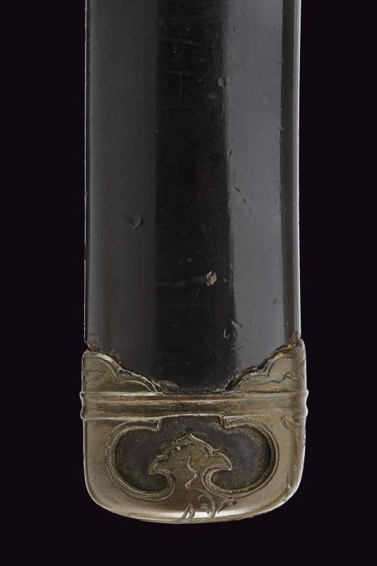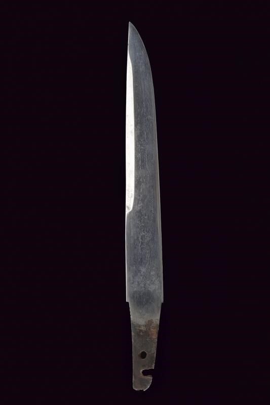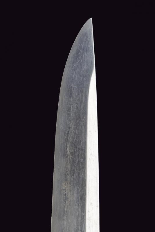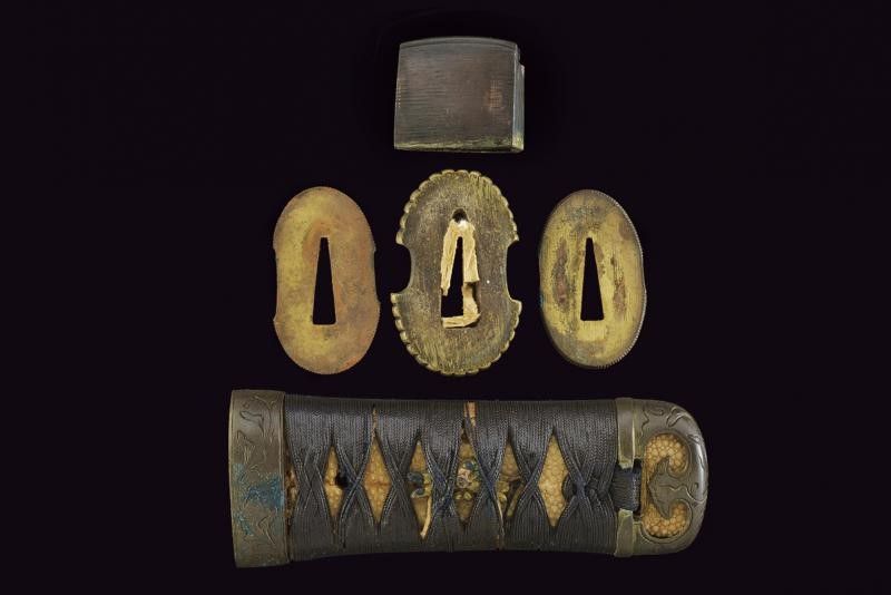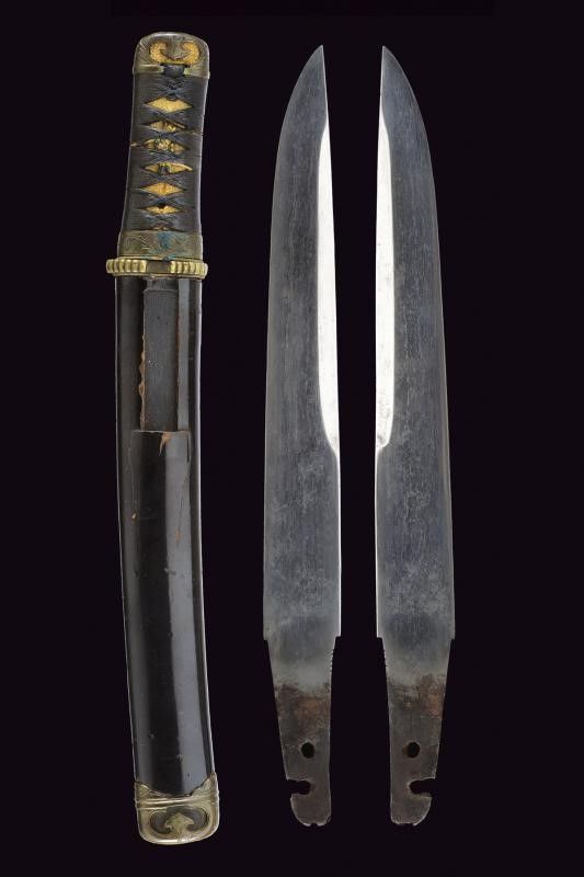Giappone, lunghezza 31,5 cm. Periodo Edo (1603-1867) Lama unokubi-zukuri, iori-mune (nagasa 19,2 cm.), con tracce di hamon e hada visibili, piccole tacche al dorso su un lato, segni di pulizia. Nakago mumei. Habaki in rame. In montatura aikuchi dell'800 con fuchi e kabutogane color ottone incisi a foglie e lavorati en suite. Menuki con tracce di doratura (forse libellule?) Vecchia tsuka-ito in cordellina di seta nera (piccoli danni), same in pelle di razza. Saya in legno con lacca nera lucida (lievi mancanze alla finitura) e kojiri lavorato en suite con i fornimenti dell'impugnatura. Scomparti per kogatana e kogai (mancanti).