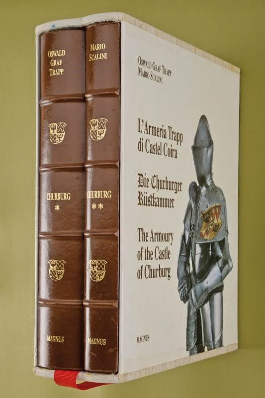 1995 'L' armeria Trapp di Castel Coira - Die Churburger Rustkammer - The armoury of the Castle of Churburg'. 2 Vol. Rilegatura con lavorazione manuale della copertina, dorso in pelle con impressioni in oro, cofanetto cartonato rivestito in tela. Vol. I°: ristampa anastatica dell'ed. del 1929, 516 pag. con 72 ill. in bicromia, testo inglese. Vol. 2°: 404 pag., 610 ill. a colori e bicromia, testo italiano, inglese e tedesco. Copie nr. 522 di 2000 esemplari, Magnus Edizioni.