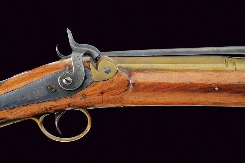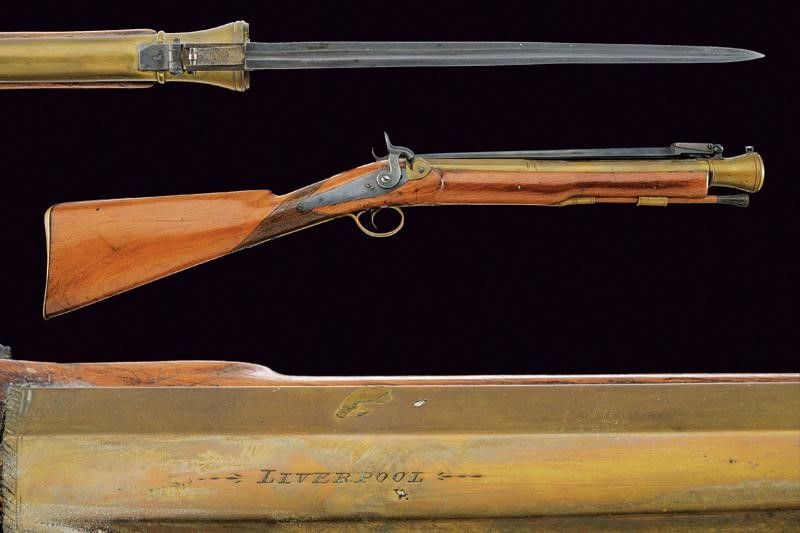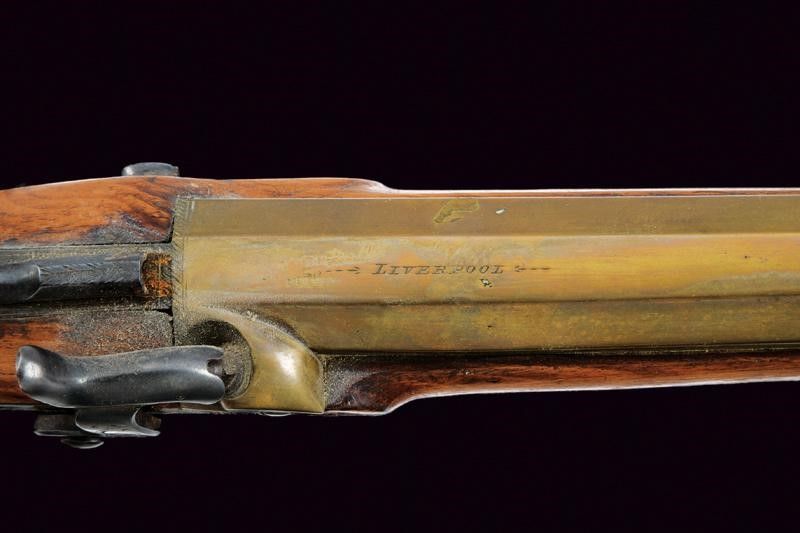 Liverpool, lunghezza 81.5 cm. Metà del XIX Secolo Canna in bronzo a tre ordini, con base ottagonale firmata 'LIVERPOOL'; volata strombata e con gioia di bocca; al dorso baionetta a scatto funzionate. Codetta con bottone di rilascio. Batteria a luminello a molla indietro, firmata 'BLISSET' ed incisa a motivi floreali. Cassa intera in legno con collo zigrinato. Fornimenti in ottone decorati en suite; bacchetta in legno con fornimenti in ottone.