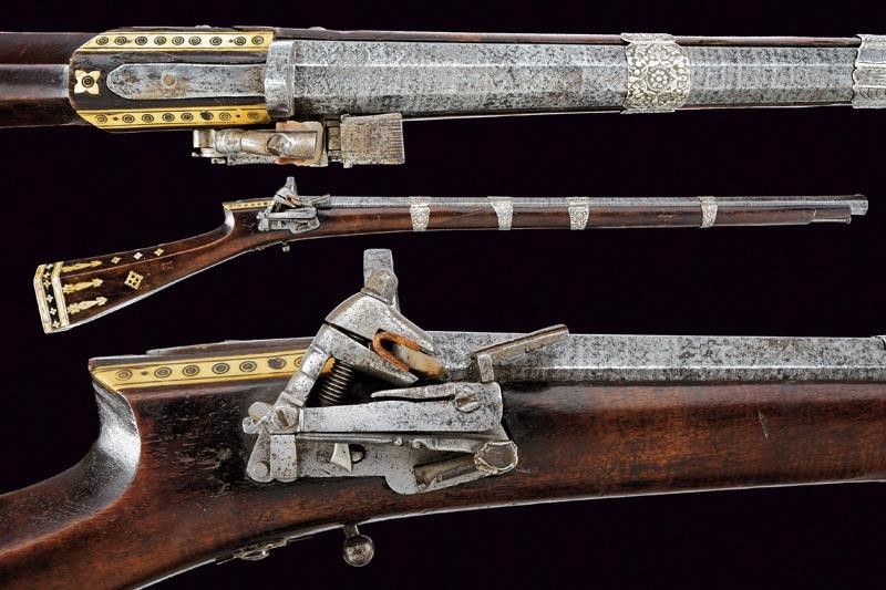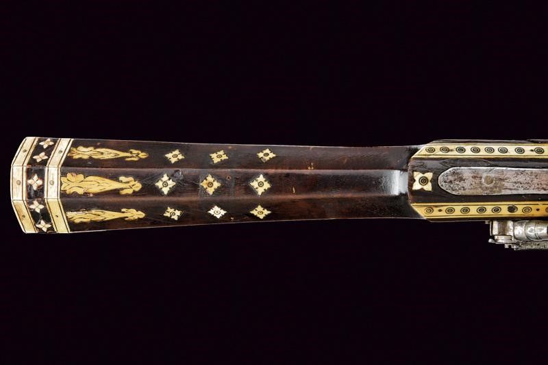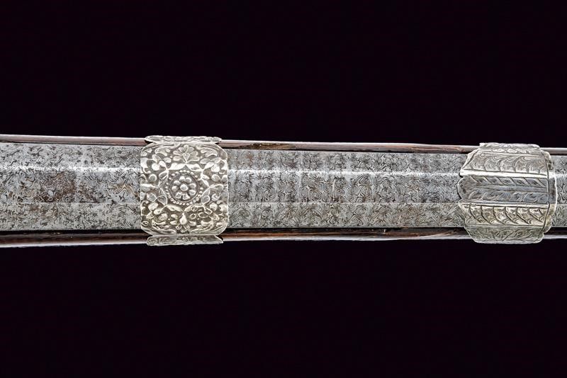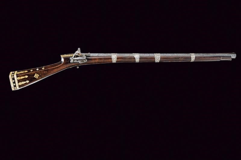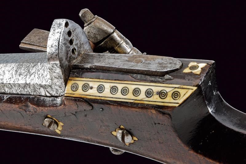Turchia, lunghezza 109.5 cm. Metà del XIX Secolo Canna ottagonale rigata, in fine damasco, con culatta dotata di traguardo alto a cuspide dotato di quattro sforature, e con mirino in rame; cal. 18 mm. Piccola batteria a pietra focaia, con molla che presenta resti di un fornimento in argento. Cassa intera in legno con tipico calcio faccettato decorato con placche in osso inciso; la parte anteriore riparata in epoca d'uso. mancanza al fornimento attorno alla fessura del grilletto. Quattro anelli reggicanna in lamina d'argento riccamente incisi a motivi floreali. Bacchetta in ferro.