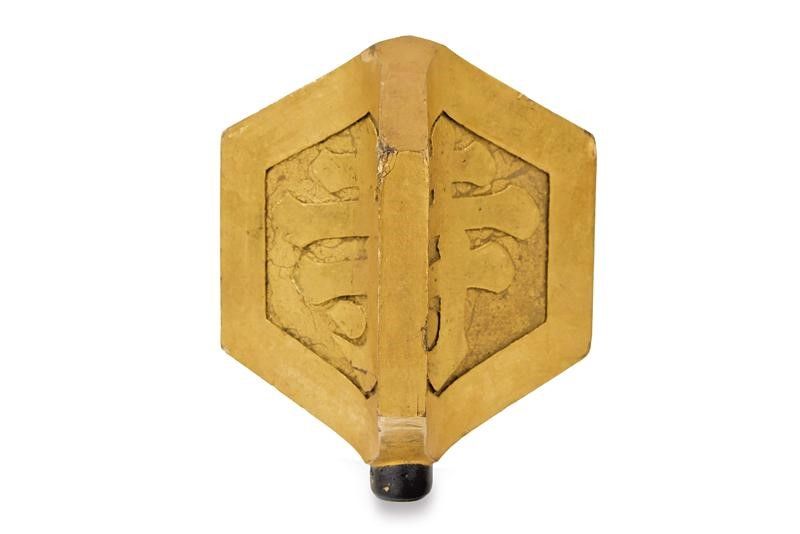 Periodo Edo (1603-1867) Un Uma-jirushi dorato recante emblema nobiliare 'Hitoe-Kikko-ni-Teranoji' sulle tre facce.