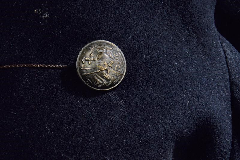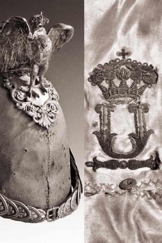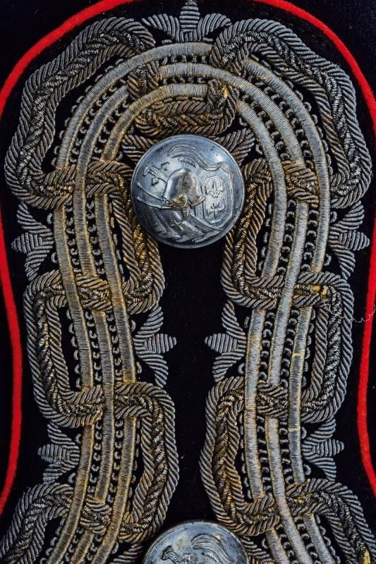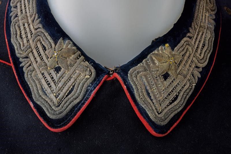 Sul petto asole per quattro placche di gran croce e per una fila di ordini su nastro. I bottoni rivestiti in argento decorati con trofeo in bassorilievo.