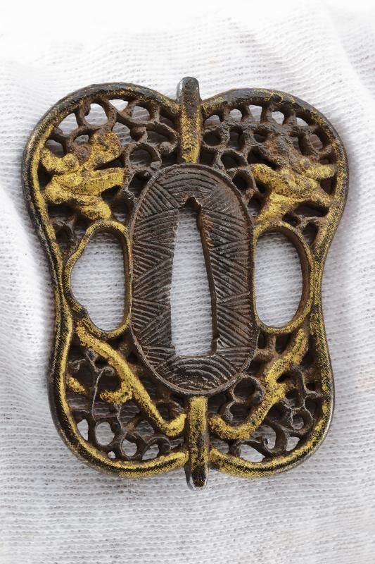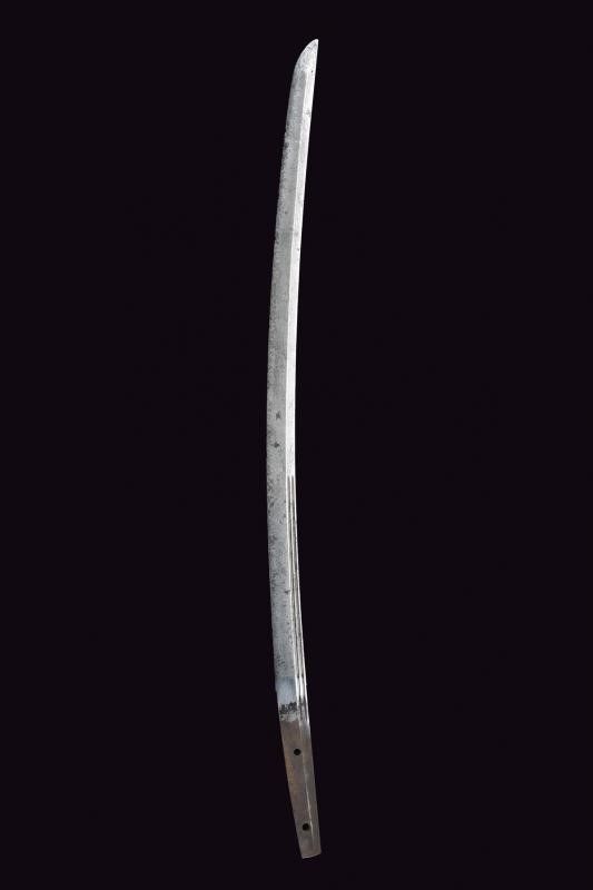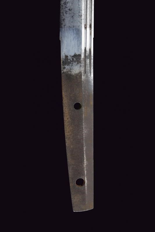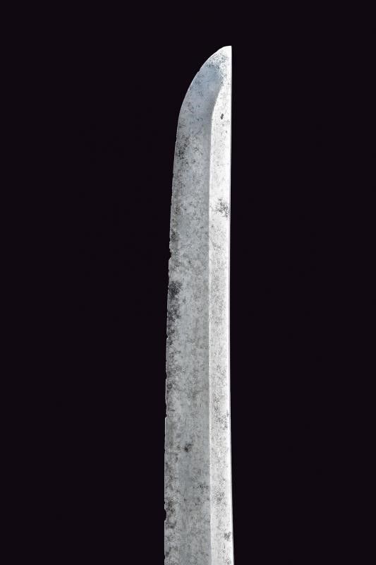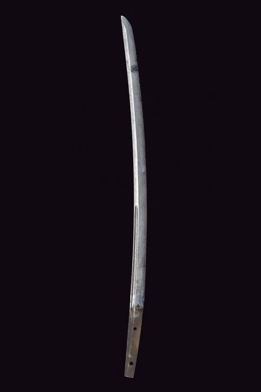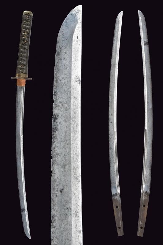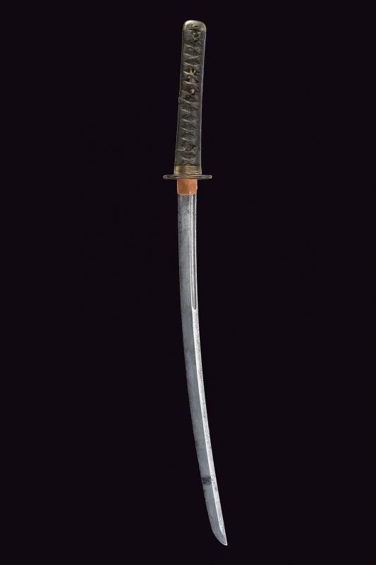 Giappone, lunghezza 73 cm. Periodo Edo (1603-1867) Lama (Nagasa 50.7 cm) con hamon e hada non visibili, diverse piccole intaccature al filo e sul boshi, scanalata su un lato; l'altro lato con doppia scanalatura più sottile; habaki in rame. Nakago mu-mei, con due mekugi-ana. Bella tsuba in ferro a forma di farfalla traforata e dorata. Fuchi e kashira in argento con resti di decorazioni, completa di menuki. Tsuka-ito con restauri. Priva di saya.