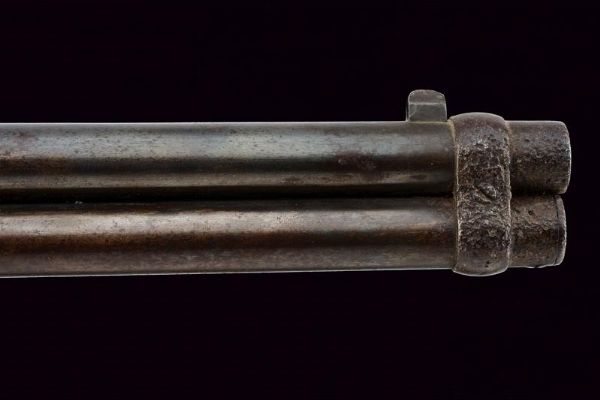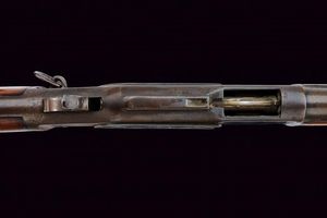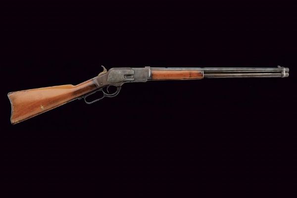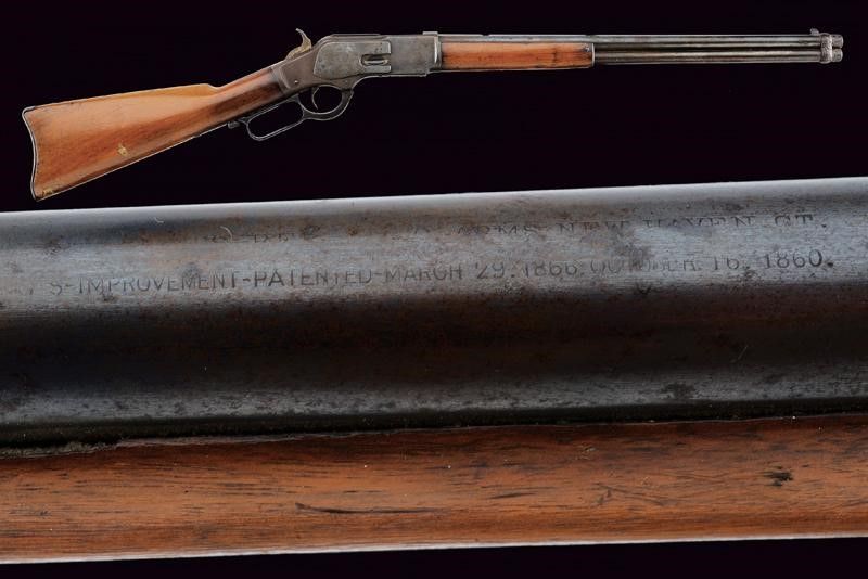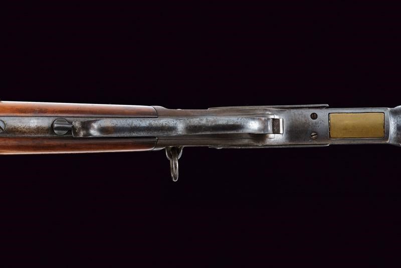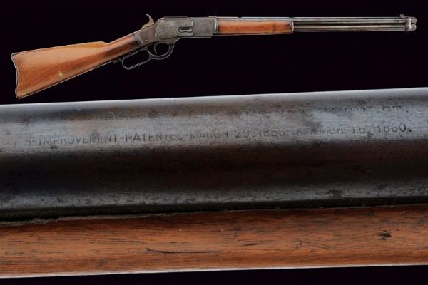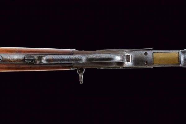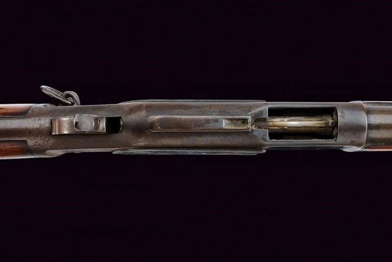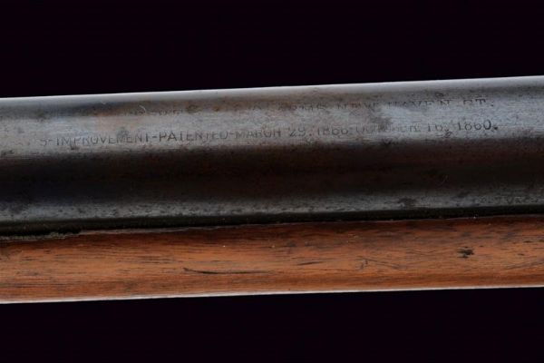 USA, lunghezza 98 cm. 1880 circa Canna tonda rigata da 20' (l'interno con forte pitting e rigatura appena visibile), recante resti di marcatura della ditta in due righe con 'KING'S IMPROVEMENT' e brevetti sino al 1860, alzo mancante. Sopra alla culatta marcatura '44 WCF'. Castello in ferro con resti di brunitura. Carrello elevatore in ottone. Meccanica non funzionante. Anello da sella sul fianco sinistro. Calcio ed astina in legno (segni d'uso e del tempo, piccoli restauri). Fornimenti in ferro. Calciolo del tipo con sportellino (senza bacchetta all'interno). I codoli del castello con resti della dicitura del modello e matricola.