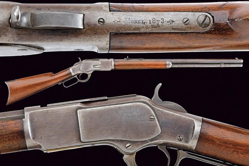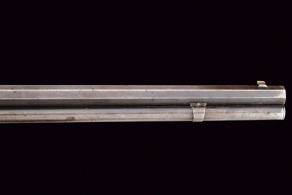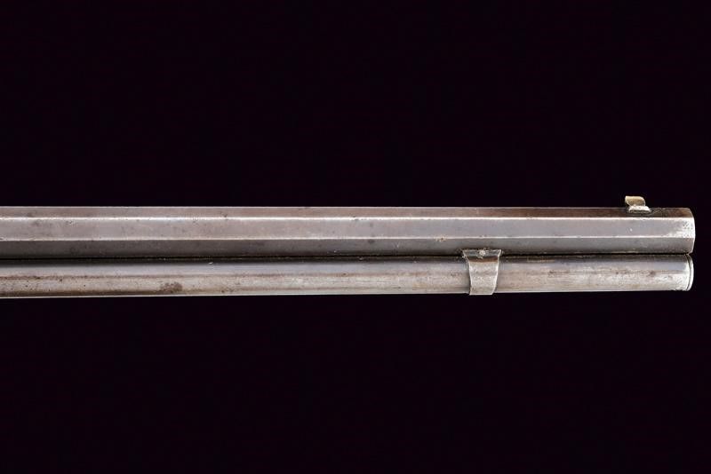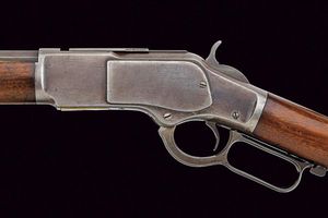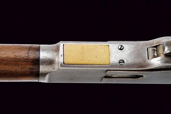 1875 - 1889 circa Canna rigata ottagonale, dotata di mirino ed alzo regolabile, marcata con indirizzo della ditta, con 'KING'S IMPROVEMENT' e brevetti dell' '55 e '60, marcatura del calibro '44 WCF'. Castello con meccanica funzionante, codolo con dicitura del modello, matr. '5532xx x'. Resti di brunitura e lievi difetti. Calcio ed astina in noce, entrambi lisci. Fornimenti in ferro.