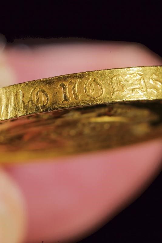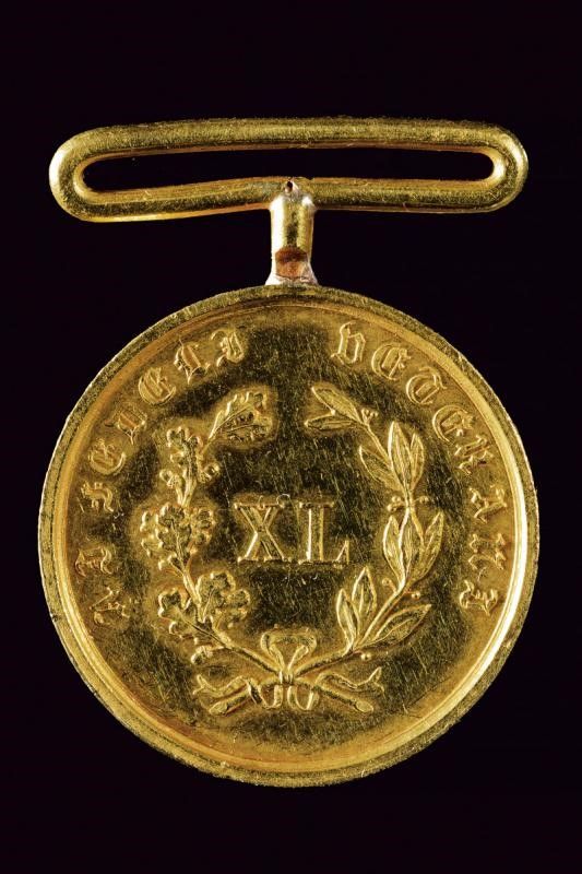 Ducato di Parma e Piacenza, diametro 2.3 cm. 1849 Rarissima medaglia per quarant'anni di servizio militare, in oro. Al dritto, in caratteri gotici, 'CARLO III DUCA DI PARMA PIACENZA ECC'; nel campo, tra bandiere ed armi, lo scudo borbonico sormontato da corona reale, con tre gigli disposti a piramide, in
