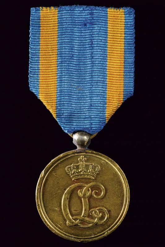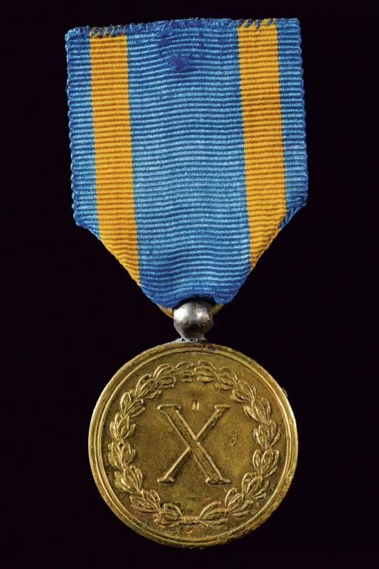 1833 Medaglia d'Anzianità di servizio per sottufficiali, per 10 anni. In bronzo. Al dritto monogramma reale 'CL' sotto corona. Al rovescio 'X' entro corona d'alloro. Su nastro. Rara.