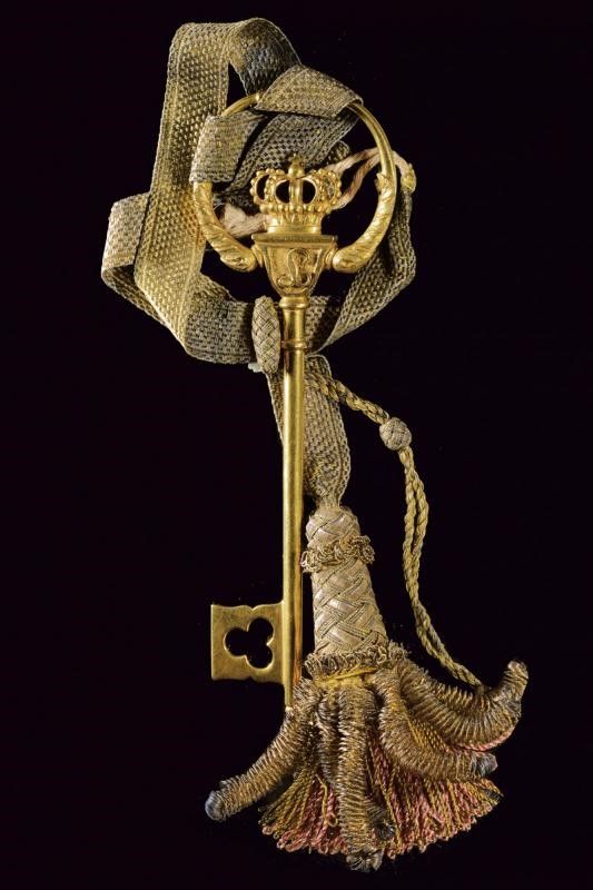Granducato di Toscana, altezza 17.7 cm. In bronzo dorato a fuoco, recante al culmine del gambo il monogramma regio 'L' (per Leopoldo II, 1824-1859) sormontato da corona traforata. Delle due nappe in canutiglia dorata solo una è ancorra presente. Rara.