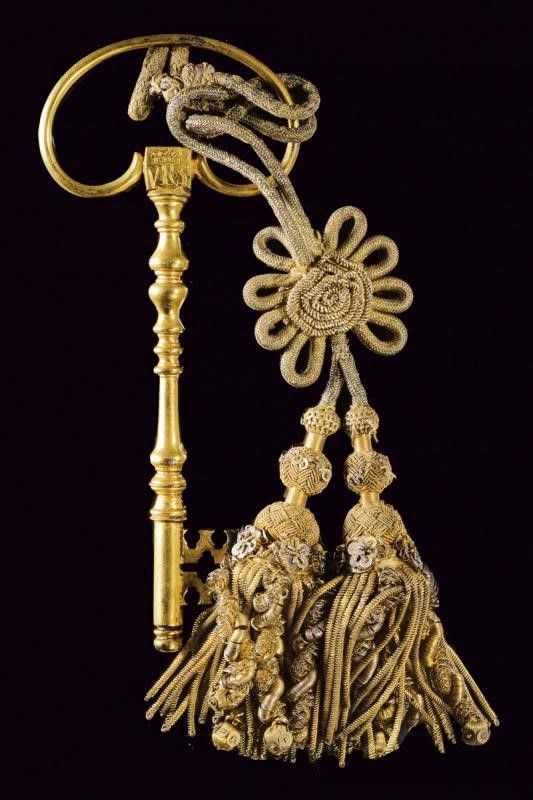 Regno delle Due Sicilie, lunghezza 19 cm. primo quarto del XIX Sec. In ferro dorato (piccole mancanze), recante al culmine del gambo il monogramma regio 'VRS' ('utriuscque regnum siciliae') sormontato da corona. Completa di nappe in canutiglia dorata. Rara.