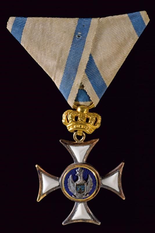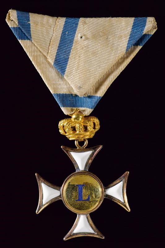Ducato di Modena e Reggio, dimensioni 3.6 x 3.6 cm. Terzo quarto del XIX Secolo Croce per cinquant'anni di servizio. Smaltata al centro e recante il monogramma 'FV', per Francesco V d'Asburgo-Este. I bracci in argento con smalti bianchi e con cornice in oro. Sotto corona e con nastro. Molto rara.