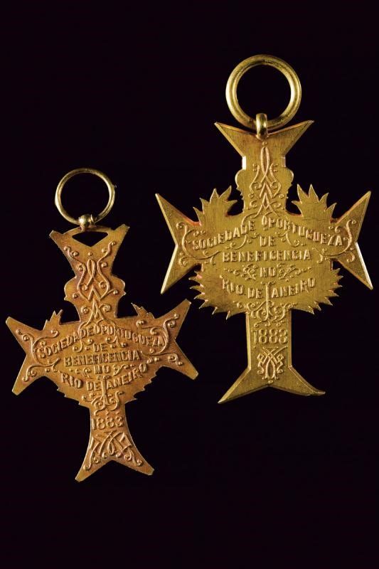 1883 Due croci simili ma di taglia differente. Sul retro iscrizione 'SOCIEDADE PORTUGUEZA DE BENEFICENCIA NO RIO DE JANEIRO 1883'.