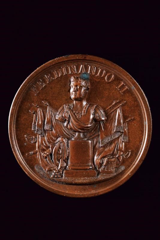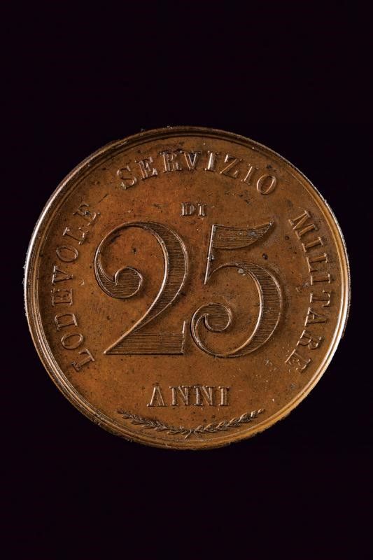 Regno delle Due Sicilie, diametro 3.95 cm. 1834 Medaglia di ricompensa militare per venticinque anni di servizio, in bronzo. Al dritto 'FERDINANDO II', nel campo busto del Re all'eroica su colonna, attorno trofei e bandiere. Al rovescio iscrizione 'LODEVOLE SERVIZIO MILITARE DI 25 ANNI'.