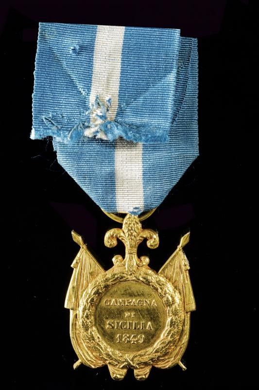 Regno delle Due Sicilie, dimensioni 2.9 x 3.8 cm. 1849 Distintivo per la repressione dei moti di Sicilia; in metallo dorato, al dritto testa di Ferdinando II a destra sotto al giglio. Al rovescio 'CAMPAGNA DI SICILIA 1849' in quattro righe. Con nastro. Molto raro.