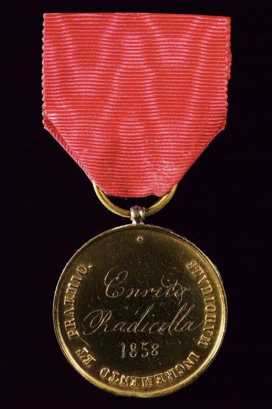 Regno delle Due Sicilie, diametro 3.4 cm. 1858 Medaglia premio in bronzo dorato (mancanze soprattutto al bordo). Al dritto busto del re a sinistra e 'FERDINANDVS II LITERARUM PRESIDIVM DECVS'. Opus 'I. MELAZZO'. Al rovescio iscrizione in corsivo 'Enrico Radicella 1858' ed intorno 'STVDIORVM INCREMENTO