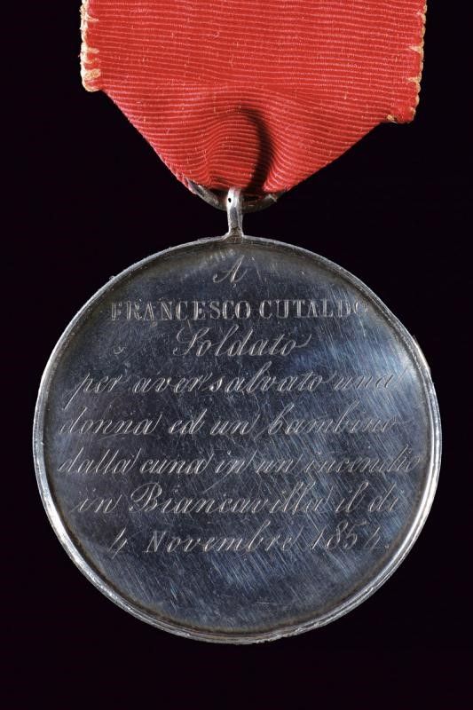 Regno delle Due Sicilie, diametro 5 cm. 1854 Medaglia dedicata al soldato Francesco Cutaldo, in argento. Al dritto busto a destra con iscrizione 'FERDINANDO II RE DEL REGNO DELLE DUE SICILIE E DI GERUSALEMME'. Opus Cariello e Ciccarelli. Al rovescio dedica 'A FRANCESCO CUTALDO Soldato per aver salva