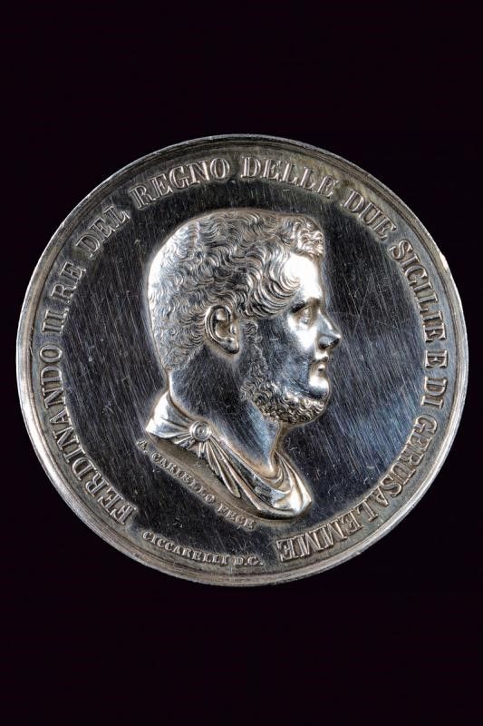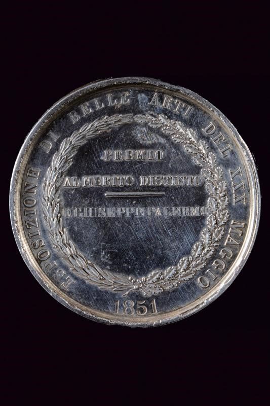 Regno delle Due Sicilie, diametro 5.3 cm. 1851 Medaglia premio all'Esposizione di belle arti del XXX maggio, in argento. Al dritto busto a destra con iscrizione 'FERDINANDO II RE DEL REGNO DELLE DUE SICILIE E DI GERUSALEMME'. Opus Cariello e Ciccarelli. Al rovescio 'ESPOSIZIONE DI BELLE ARTI DEL XXX M