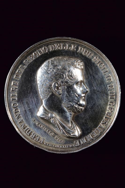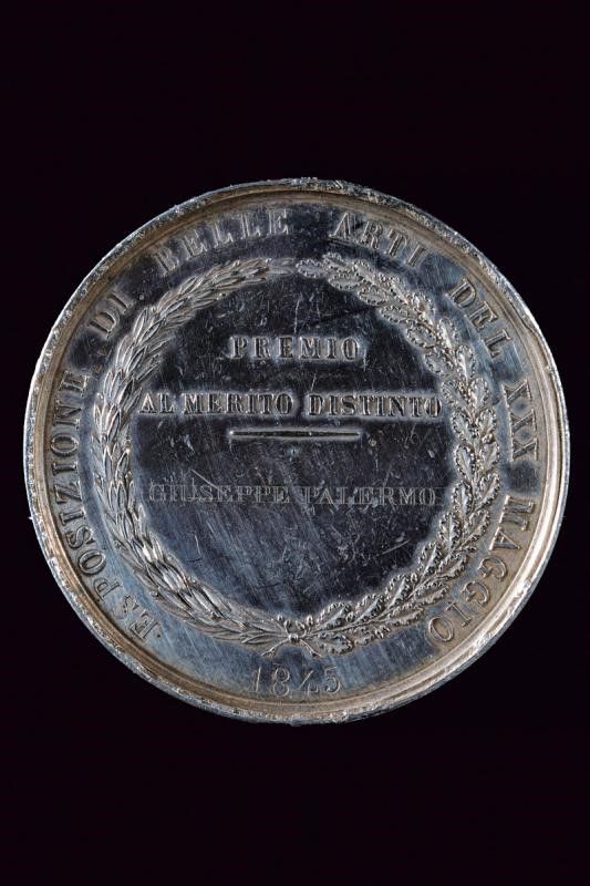 Regno delle Due Sicilie, diametro 5.2 cm. 1845 Medaglia premio all'Esposizione di belle arti del XXX maggio, in argento. Al dritto busto a destra con iscrizione 'FERDINANDO II RE DEL REGNO DELLE DUE SICILIE E DI GERUSALEMME'. Opus Cariello e Ciccarelli. Al rovescio 'ESPOSIZIONE DI BELLE ARTI DEL XXX M