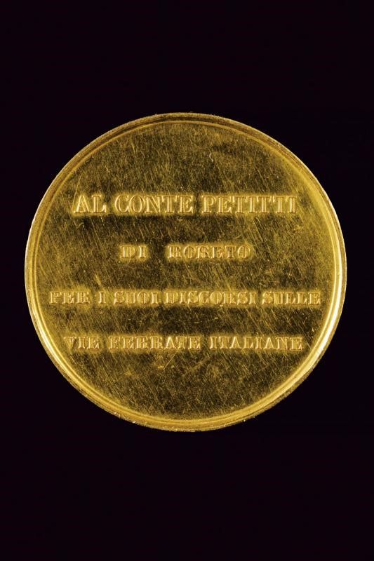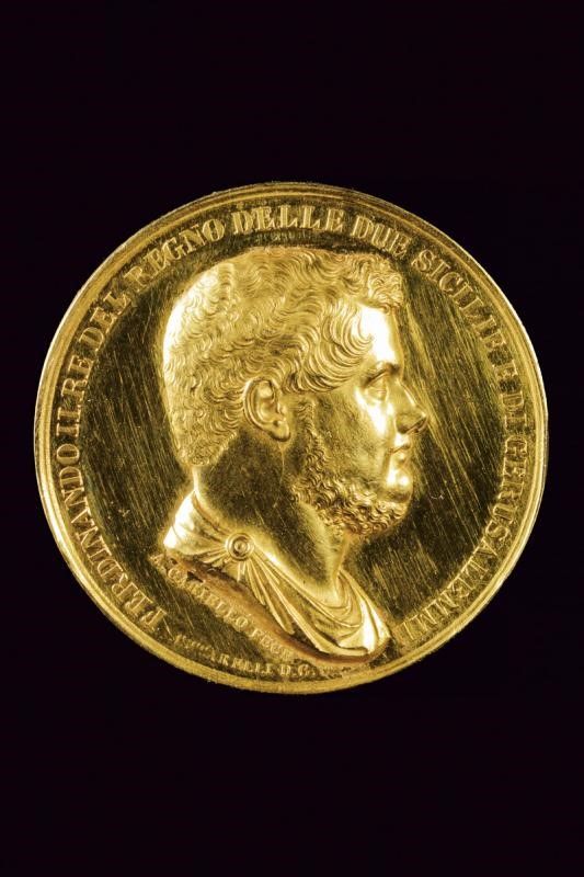 Regno delle Due Sicilie, diametro 4 cm. 1845 circa Medaglia per i discorsi sulle vie ferrate, al merito civile, in oro. Al dritto busto a destra con iscrizione 'FERDINANDO II RE DEL REGNO DELLE DUE SICILIE E DI GERUSALEMME'. Opus Cariello e Ciccarelli (il secondo poco visibile). Al revescio 'AL CONTE PETI