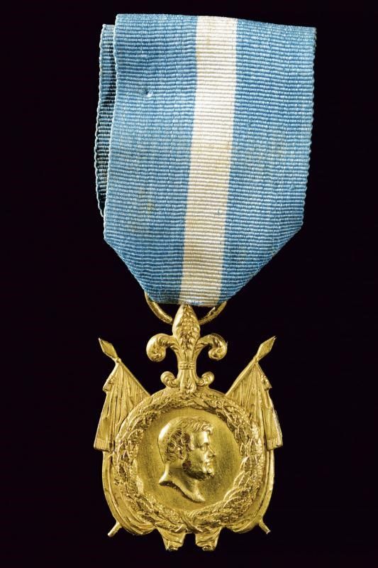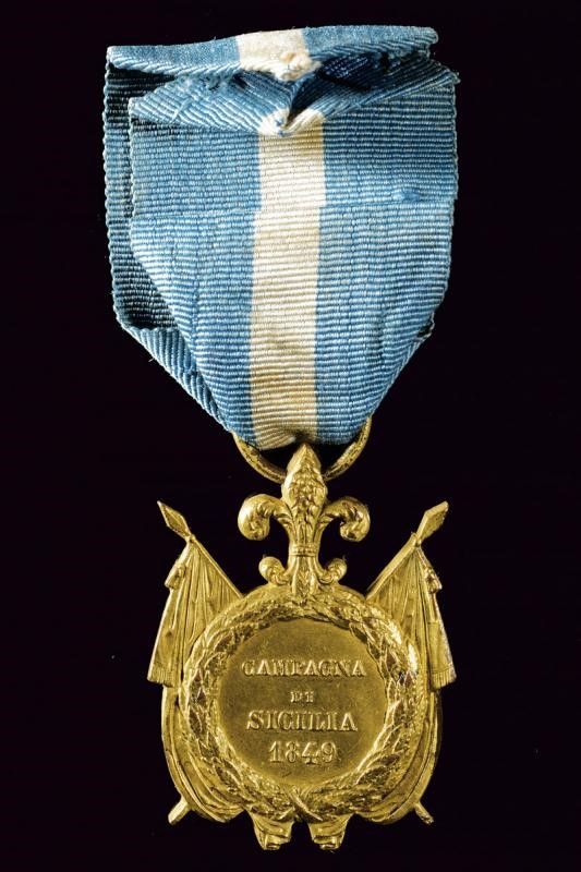 Regno delle Due Sicilie, dimensioni 2.8 x 3.9 cm. 1849 Distintivo per la repressione dei moti di Sicilia; in bronzo, al dritto testa di Ferdinando II a destra sotto al giglio. Al rovescio 'CAMPAGNA DI SICILIA 1849' in quattro righe. Con nastro. Raro.