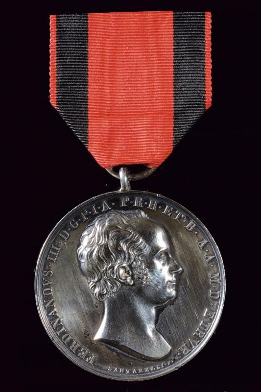 Granducato di Toscana, diametro 4.1 cm. primo quarto del XIX Sec. Medaglia Merentibus. Al dritto, testa a destra con iscrizione 'FERDINANDUS III D. G. P.I. A. R. P. R. H. ET B. A. A. M. D. ETRUR.'. Opus SANTARELLI F. Al rovescio, 'MERENTIBVS' tra fronde di quercia. 40 g. Rara.