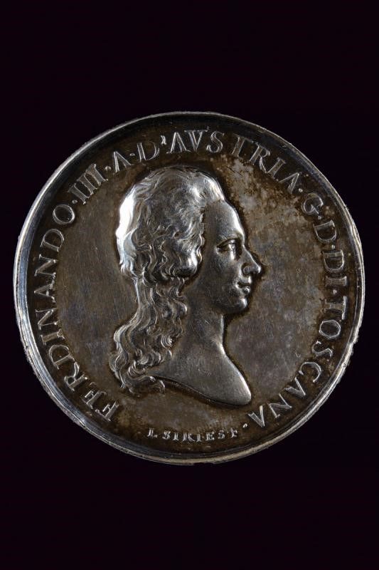 Granducato di Toscana, diametro 6 cm. primo quarto del XIX Sec. Medaglia premio in argento. Al dritto testa a destra ed iscrizione 'FERDINANDO III. A. D'AVSTRIA G. D. DI TOSCANA'. Opus L. SIRIES F. Al rovescio 'PREMIO DELLE REALI SCUOLE DELLE BELLE ARTI DI FIRENZE'. 88 g. Rara.