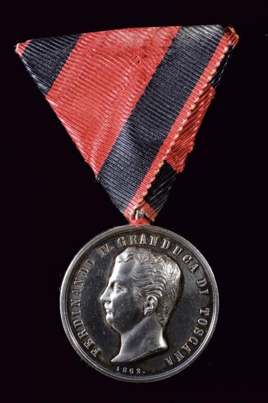 1862 Medaglia al merito. In argento. Al dritto busto di Ferdinando a sinistra, con iscrizione 'FERDINANDO IV GRANDUCA DI TOSCANA', in basso 1862. Al verso 'AL MERITO'. Con nastro triangolare.