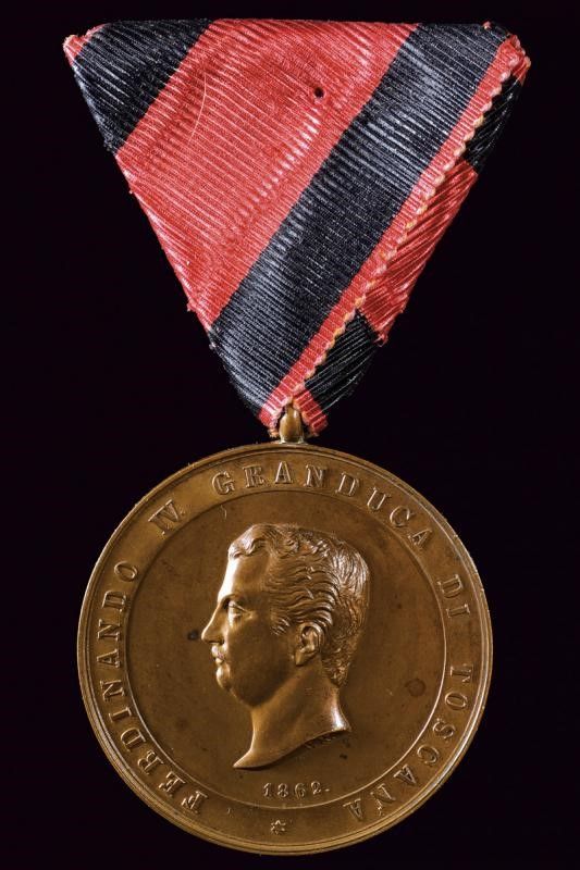 1862 Medaglia al merito. In bronzo. Al dritto busto di Ferdinando a sinistra, con iscrizione 'FERDINANDO IV GRANDUCA DI TOSCANA', in basso 1862. Al verso 'AL MERITO'. Con nastro triangolare. Rara.