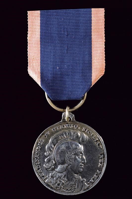Regno delle Due Sicilie, diametro 3.6 cm. 1797 Medaglia al valor militare, in argento. Al dritto busto corazzato a destra con elmo piumato e mantello attorniato dall'iscrizione 'FERDINANDVS IV UTRIUSQ. SICILIAE REX P.F.A.'; Opus 'Morghen'. Al rovescio soldato in piedi, volto a destra, reggente scudo e