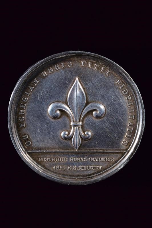 Regno delle Due Sicilie, diametro 4.8 cm. 1815 Rarissima medaglia per l’arresto di Gioacchino Murat a Pizzo Calabro, in argento. Al dritto 'FERDINANDUS IV UTRIUSQUE SICILIAE REX P F A', nel campo bellissima testa coronata del Re a destra. Al rovescio giglio borbonico e iscrizione al bordo 'OB EGREGIAM