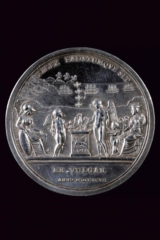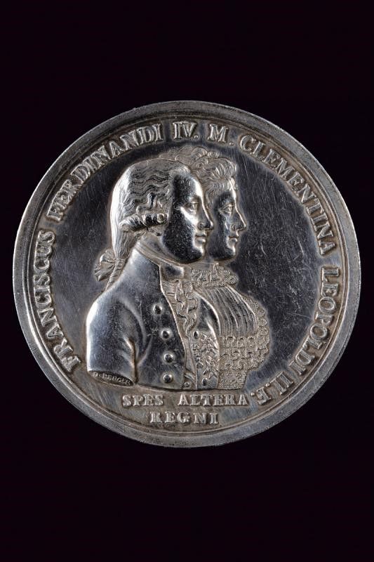 Regno delle Due Sicilie, diametro 7.1 cm. 1797 Rara medaglia coniata in occasione del matrimonio del principe ereditario Francesco, duca di Calabria (1777-1830) e secondogenito di Ferdinando IV di Napoli e Sicilia, con la cugina Maria Clementina, figlia dell'imperatore Leopoldo II d'Austria; in argent