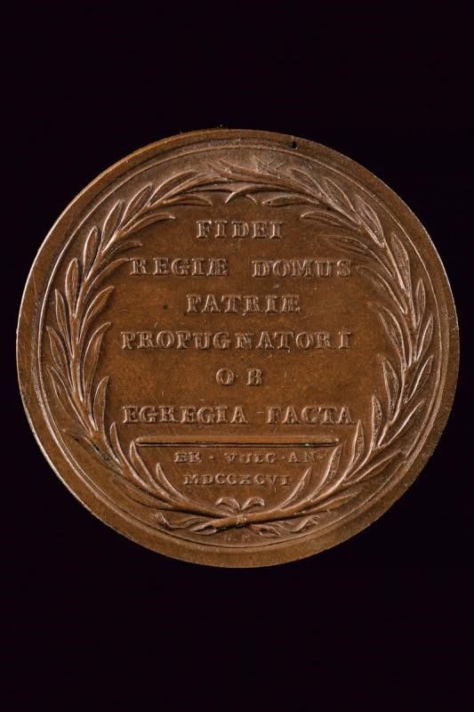 Regno delle Due Sicilie, diametro 6 cm. 1796 Medaglia conferita agli ufficiali superiori dei reggimenti di cavalleria reduci dalle battaglie di Lombardia, in bronzo. Al dritto busto del Re Ferdinando IV, corazzato e con l’elmo in testa, con la chioma fluente, attorniato da iscrizione 'FERDINAN. IV U