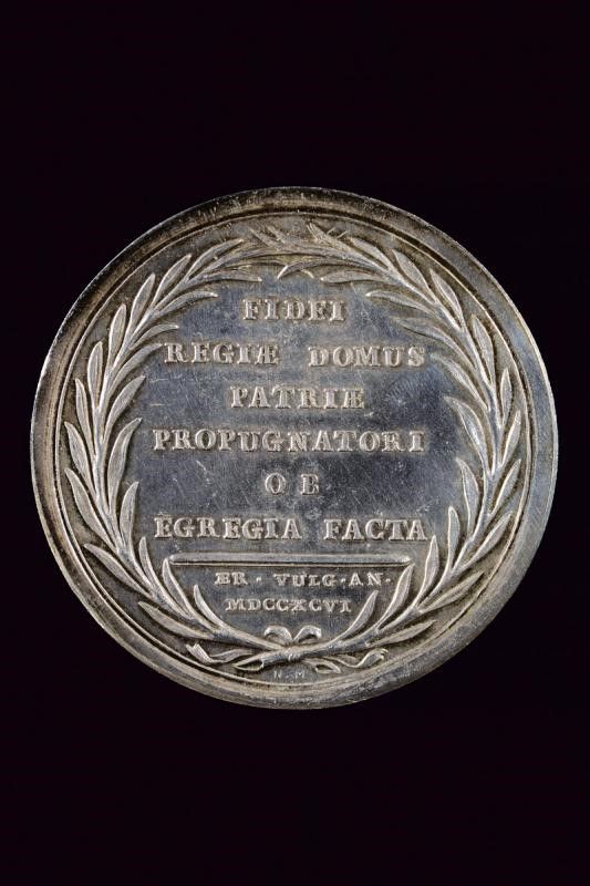 Regno delle Due Sicilie, diametro 6 cm. 1796 Medaglia conferita agli ufficiali superiori dei reggimenti di cavalleria reduci dalle battaglie di lombardia, in argento. Al dritto busto del Re Ferdinando IV, corazzato e con l’elmo in testa, con la chioma fluente, attorniato dall'iscrizione 'FERDINAN. I