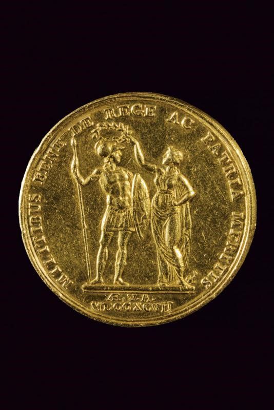 Napoli, diametro 3.6 cm. 1797 Rarissima medaglia in oro per la ricompensa di atti di valore militare. Al dritto busto corazzato a destra con elmo piumato e mantello, al bordo iscrizione ' FERDINANDVS IV UTRIUSQ. SICILIAE REX P.F.A.'. Opus 'Morghen'. Al rovescio soldato in piedi, volto