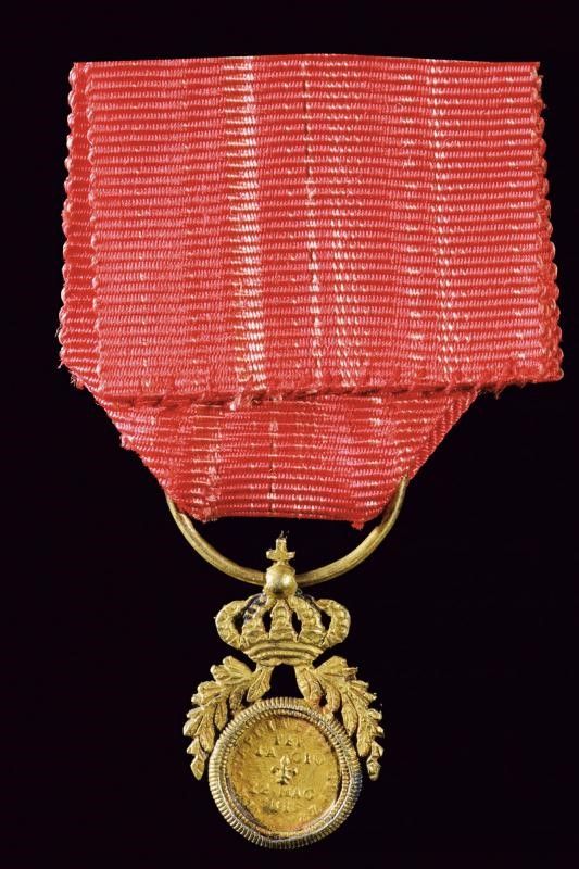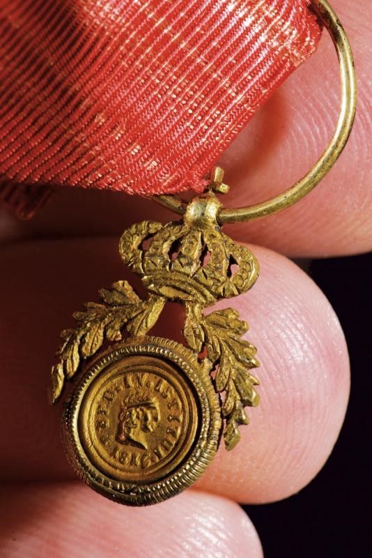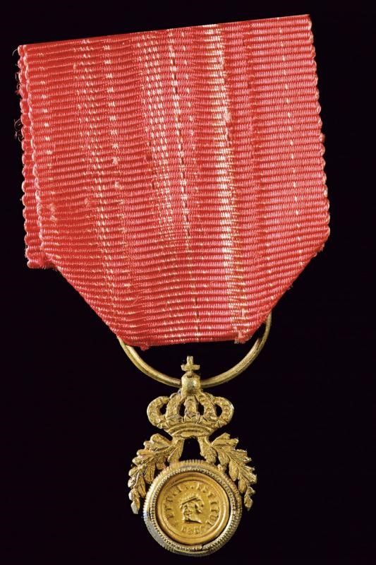 Regno delle Due Sicilie, dimensioni 1.4 x 2.2 cm. 1816 Medaglia al Merito per la Guardia di Sicurezza per i fatti del 22 Maggio 1815. Miniatura in metallo dorato. Con corona e fronde. Al dritto testa del re a destra e iscrizione 'FERDINANDO IV ISTITUI 1816'. Al rovescio giglio borbonico e iscrizione 'ALLA GUA