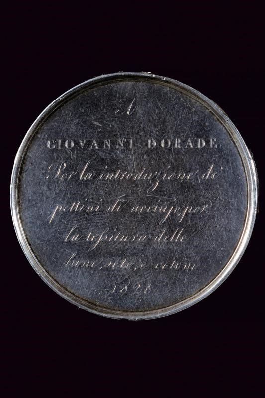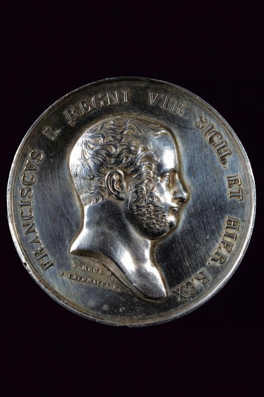 Regno delle Due Sicilie, diametro 5.2 cm. 1828 Medaglia premio in argento. Al dritto iscrizione al bordo 'FRANCISCVS I REG VTR SIC ET HIER REX', al centro busto del re verso destra; opus 'F. REGA D. / V. CATENACCI F.'; in basso le lettere 'R. M. P.'. Al rovescio 'A GIOVANNI DORADE / Per la introduzion