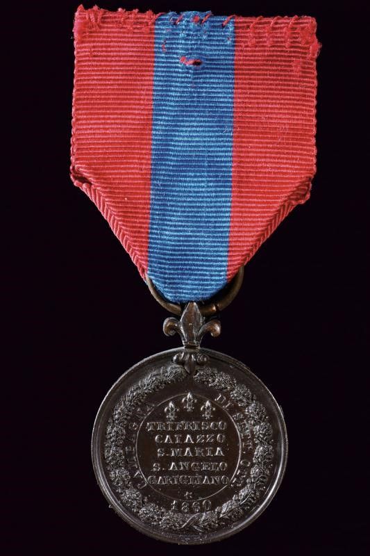 Regno delle Due Sicilie, diametro 2.7 cm. 1860 Medaglia per la campagna di settembre - ottobre 1860 (medaglia di Trifrisco), in bronzo. Al dritto 'FRANCESCO II. RE DELLE DUE SICILIE', nel campo testa del Re a sinistra entro una corona di fronde di quercia e di alloro chiusa in basso da un nastro. Al r