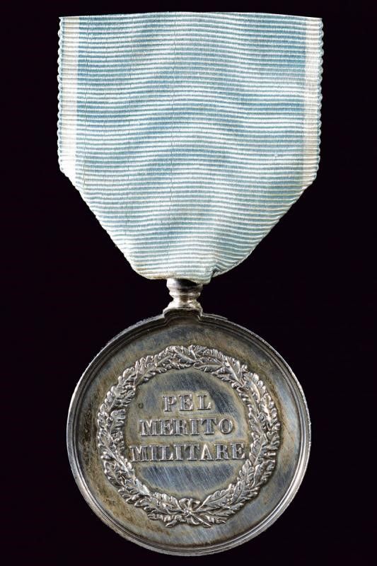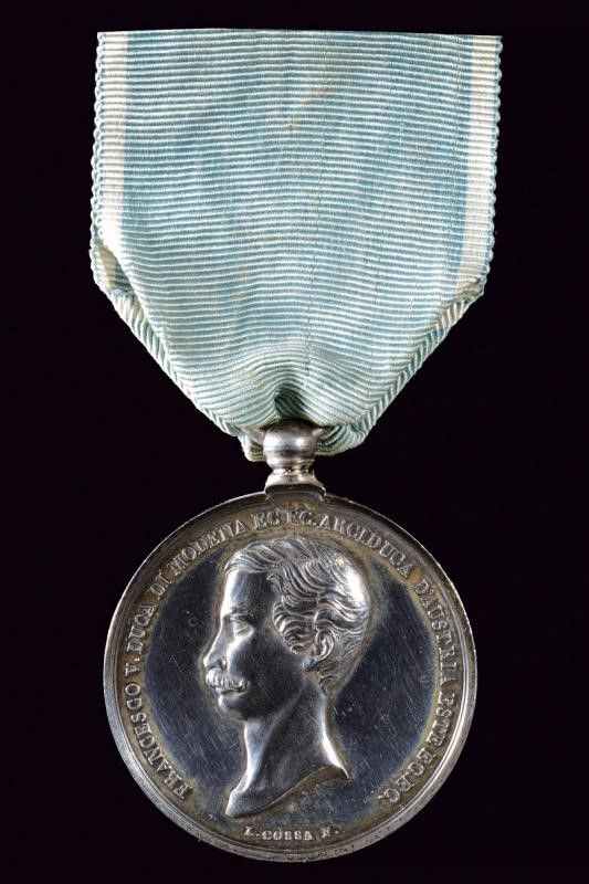 Ducato di Modena e Reggio, diametro 3.5 cm. 1852 Medaglia estense al merito militare, in argento. Al dritto busto verso sinistra, al bordo 'FRANCESCO V DUCA DI MODENA EC EC ARCIDUCA D'AUSTRIA ESTE EC EC'; opus 'L. COSSA F.' Al rovescio, entro corona d'alloro, la dedica 'PEL MERITO MILITARE'. Su nastro a
