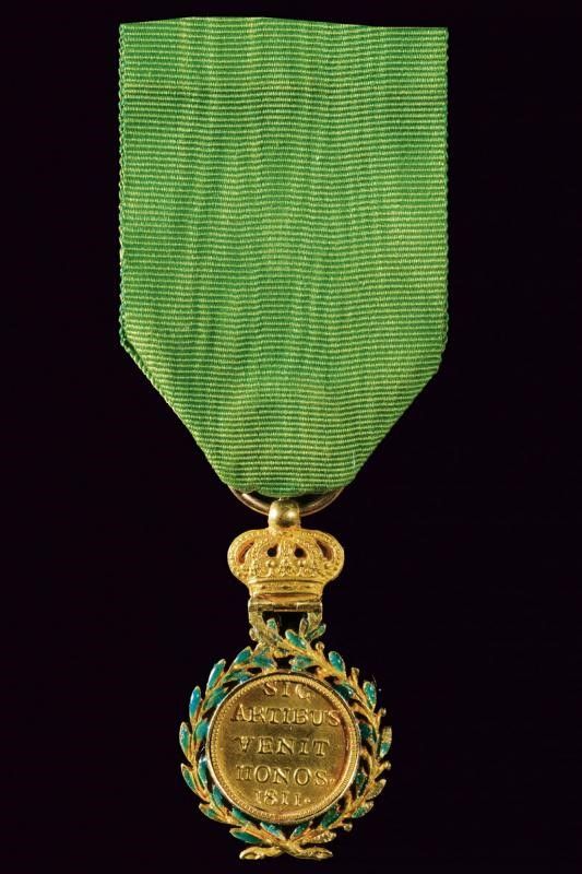 1811 Medaglia d'Oro al Merito delle Arti. In oro e smalti (piccole mancanze), sotto corona. Su entrambi i lati iscrizione 'SIC ARTIBUS VENIT HONOS 1811'. Su nastro. 3 g. Molto rara.