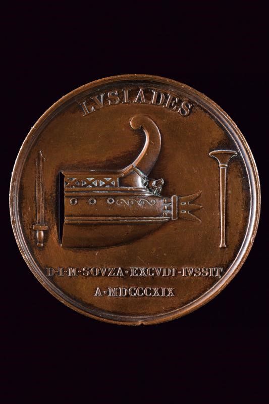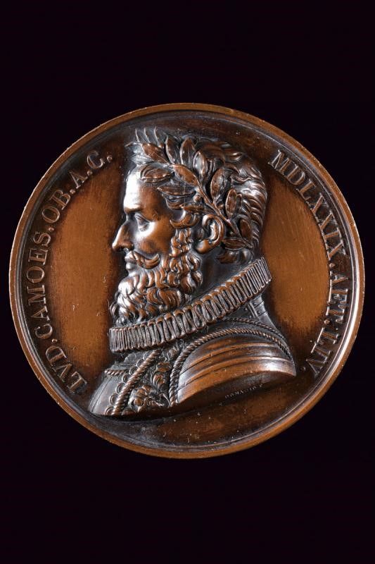 Portogallo, diametro 6 cm. 1819 Medaglia Luís de Camões, Os Lusíadas, in bronzo. Al dritto busto a sinistra ed iscrizione 'LVD. CAMOES. OB. A. C. – MDLXXIX. AET. LIV.' Opus Donadio F. Al rovescio prua di una galea romana. 'LVSIADES / ID. I. M. SOVZA. EXCVDI. IVSSIT / A. MDCCCXIX'.