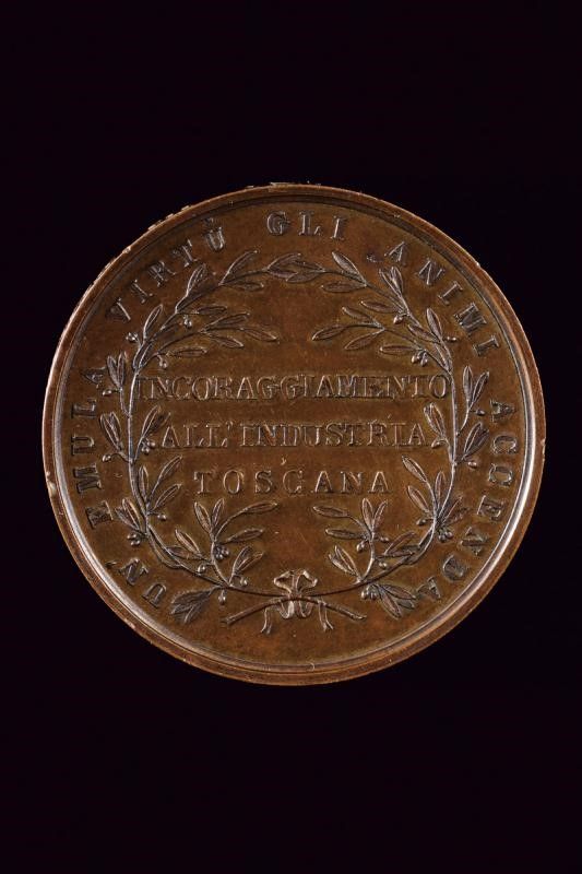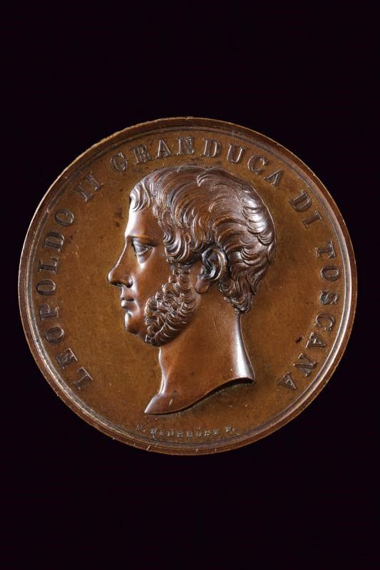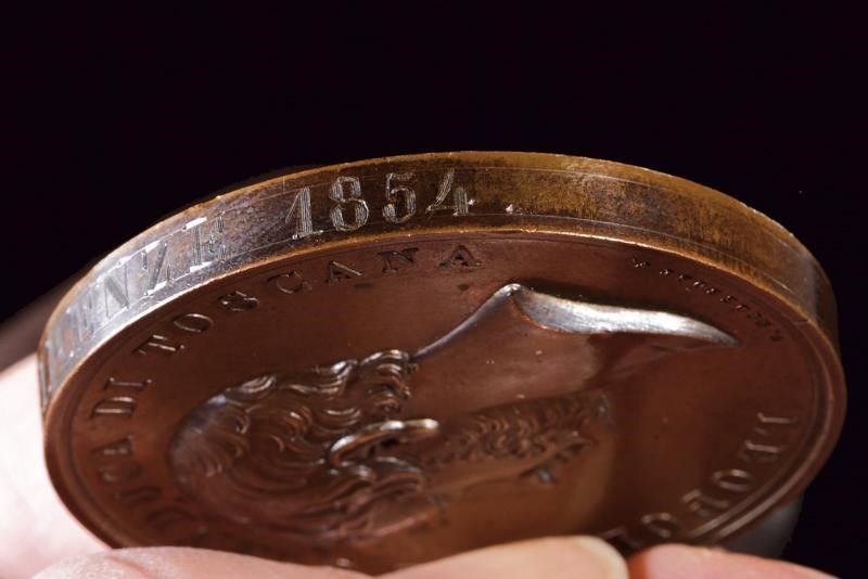 Granducato di Toscana, diametro 4.5 cm. 1854 Medaglia per l'incoraggiamento all'industria toscana, in bronzo. Al dritto busto verso sinistra e l'iscrizione 'LEOPOLDO II GRANDUCA DI TOSCANA', opus 'G. NIDERÖST F.' Al rovescio 'UN' EMULA VIRTU' GLI ANIMI ACCENDA', nel campo, entro corona di lauro, 'IN