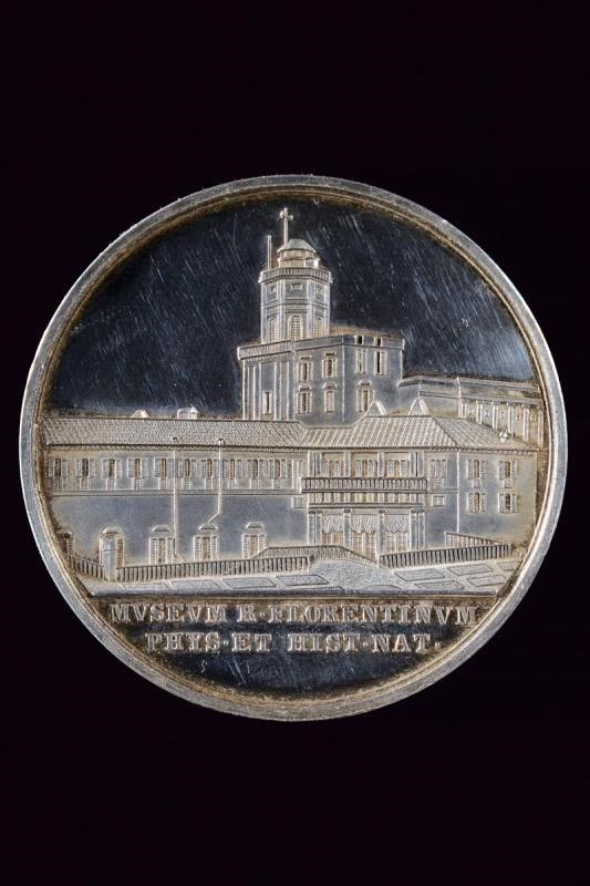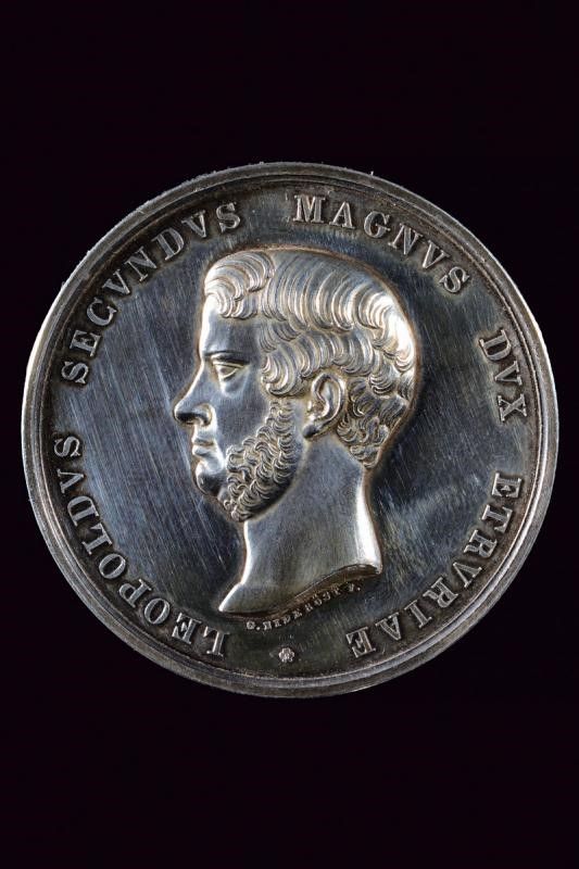 Granducato di Toscana, diametro 4.8 cm. 1840 Medaglia riservata ai benemeriti per importanti donazioni al museo di Fisica e storia naturale di Firenze. In argento. Al dritto testa a sinistra ed iscrizione 'LEOPOLDVS SECVNDVS MAGNVS DVX ETRVRIAE'. Opus 'G. NIDERÖST F.'. Al rovescio vista della specol